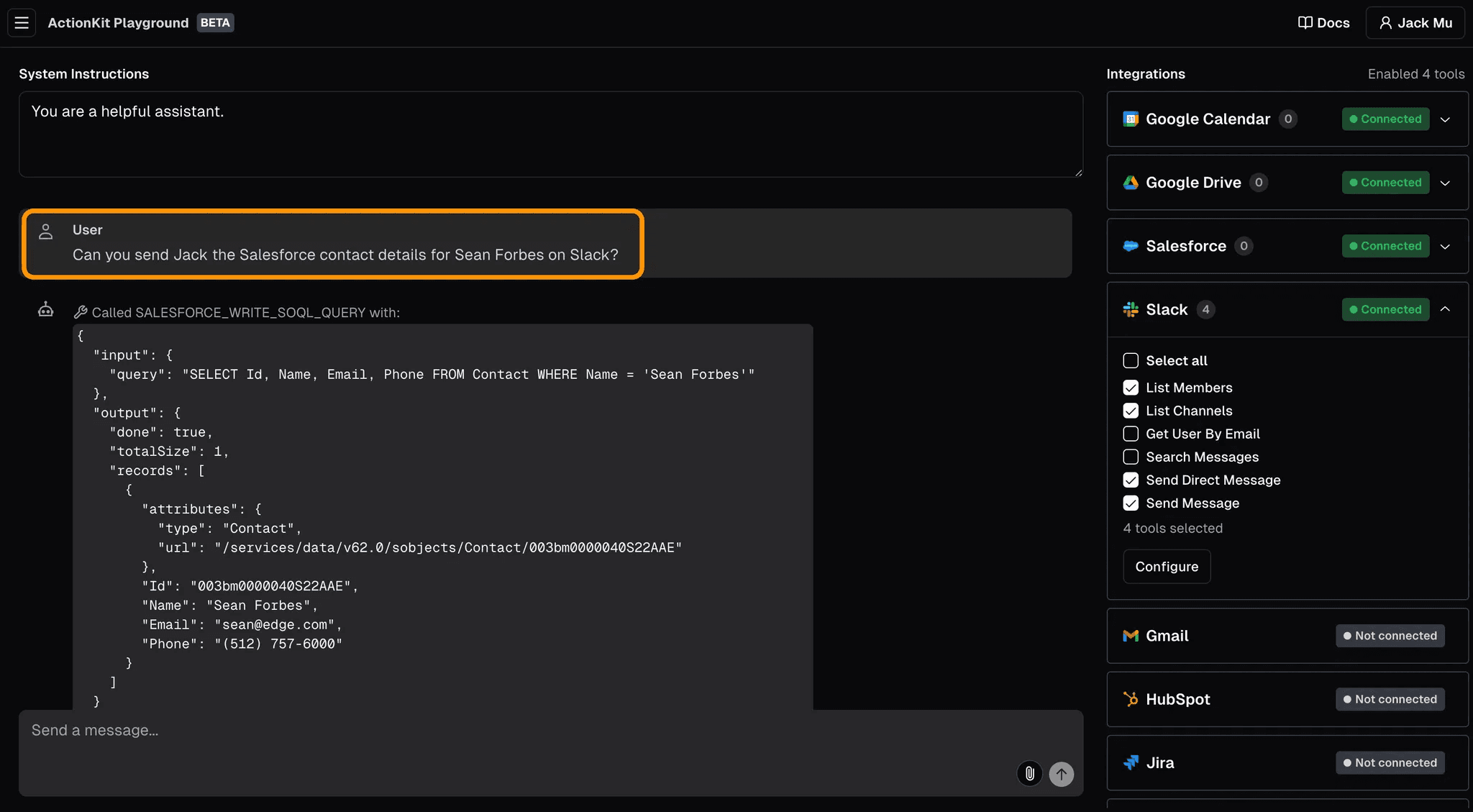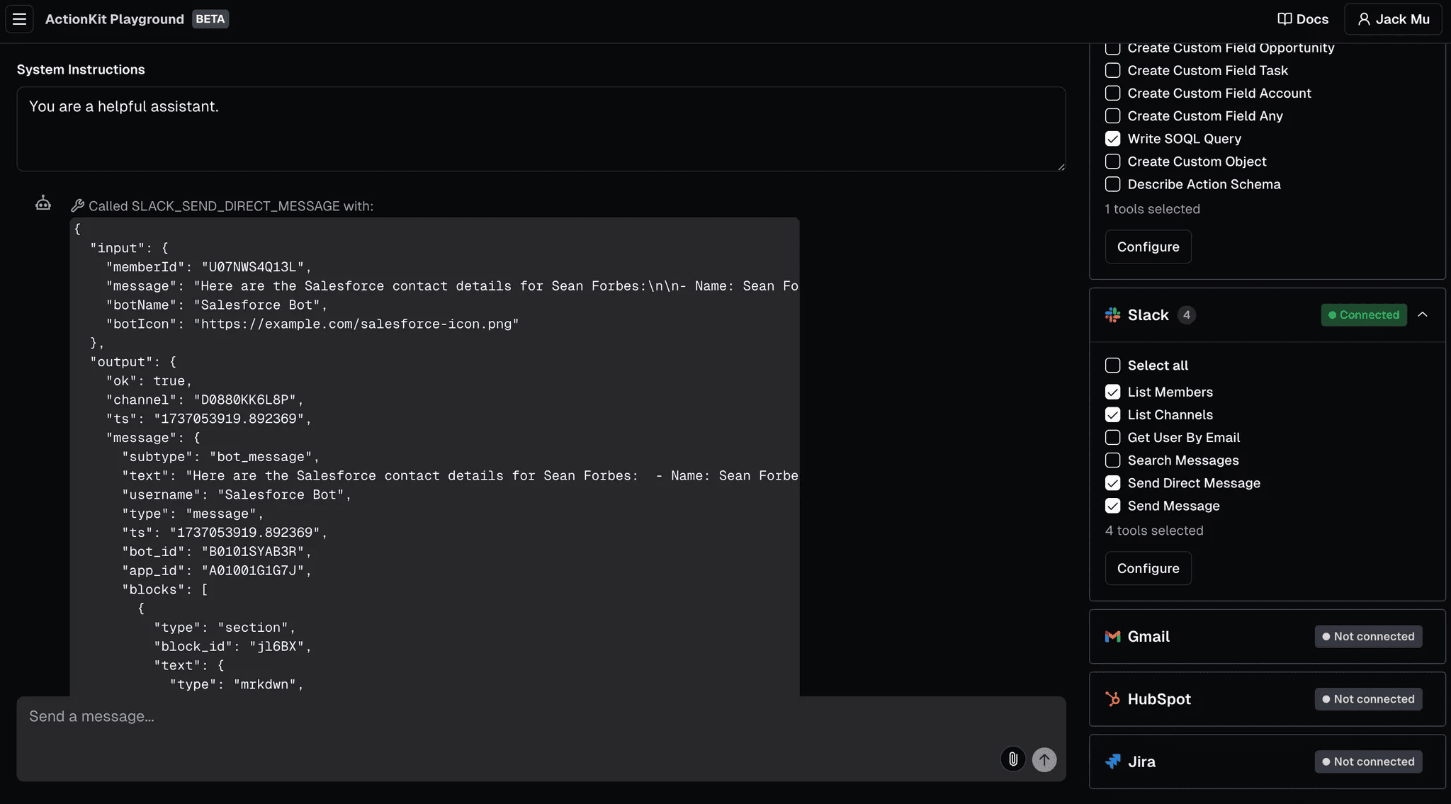 In this example, the user asked the AI agent to send Salesforce Contact data in Slack. Our agent was able to call the SALESFORCE_WRITE_SOQL_QUERY to retrieve the contact details, followed by a SLACK_SEND_DIRECT_MESSAGES tool to send that Salesforce data via Slack with one message to the agent.