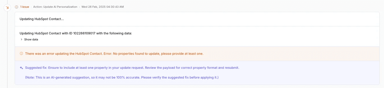 However, when it comes to tool execution errors, it’s important to provide user-readable errors that help users understand what went wrong. This can involve passing through the underlying error from the 3rd-party side directly to the user, or having a separate AI agent turn the underlying error into something that your users can understand. Here’s an example from a sales & marketing automation product called Default.