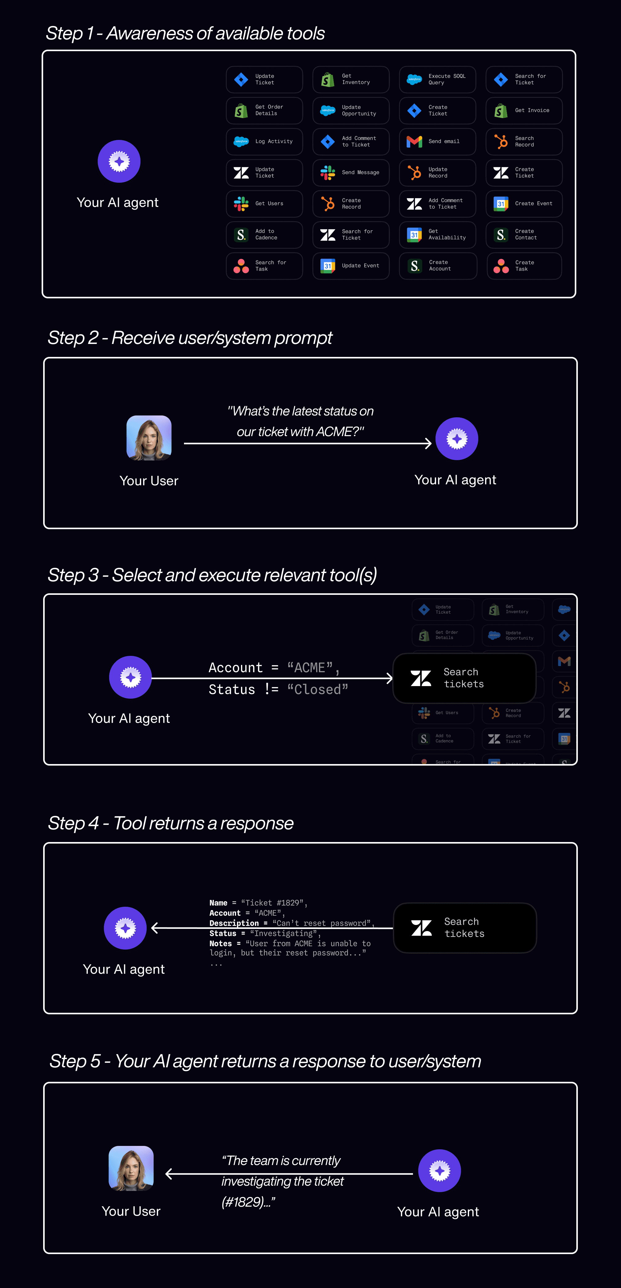 We used a support agent use case above to illustrate the tool calling flow, but let’s use a few real life examples of agent tool calling.