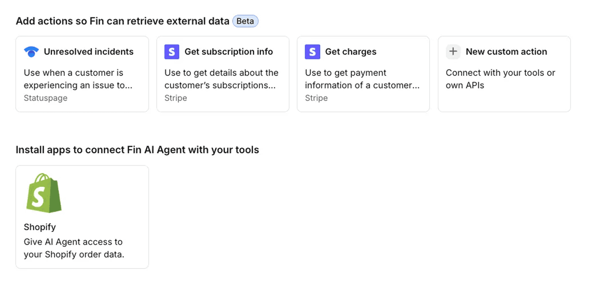 Their AI support agent product, Fin, can query live external data such as Shopify for inventory + order status, to help answer questions from their users’ customers.