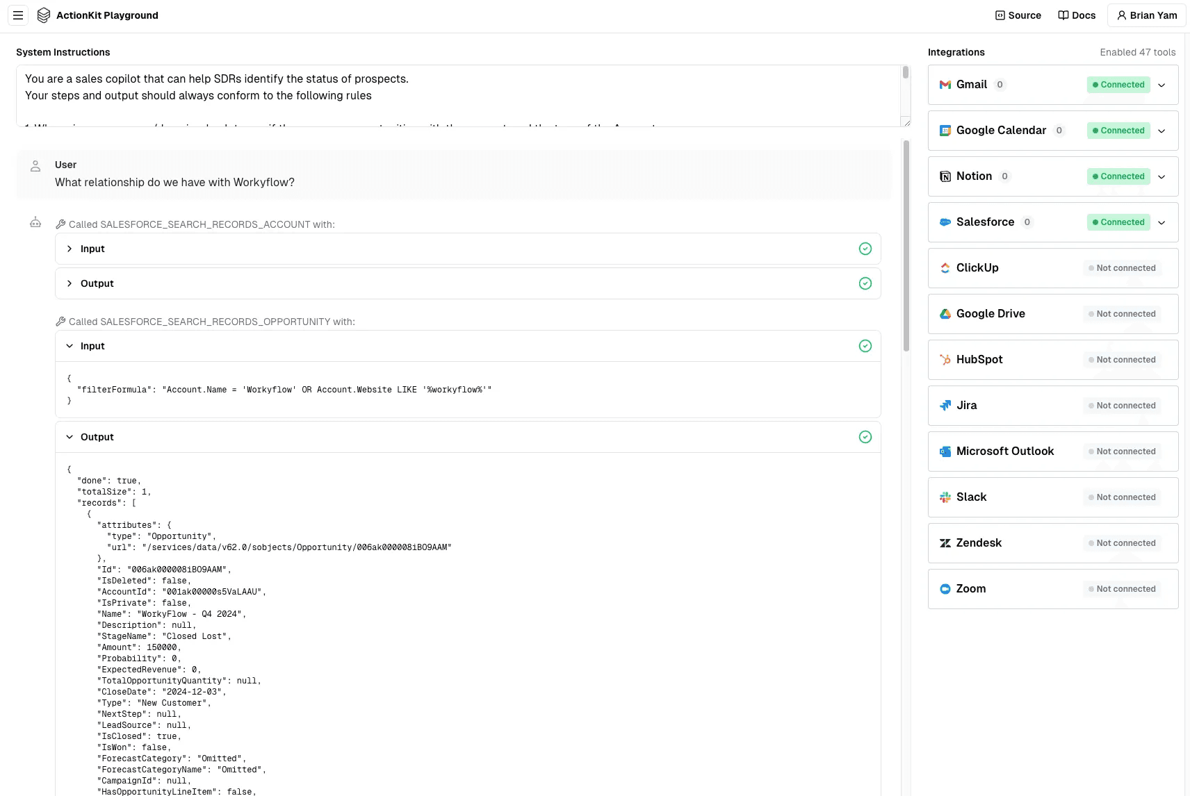 Here’s an example of our playground for ActionKit, where our AI agent displays all the inputs and output payloads of every action it took as a result of a prompt.