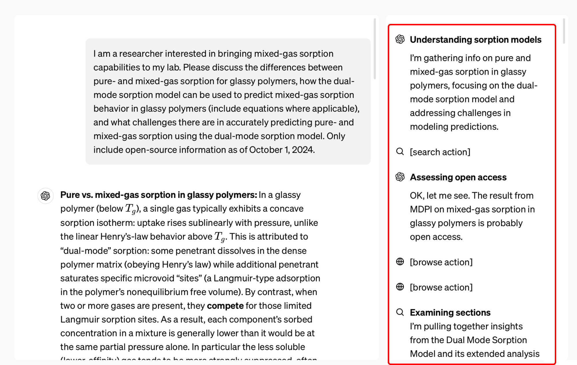 To illustrate the first type of log, here’s an example with OpenAI’s Deep Research model. On the right, you can see the steps OpenAI’s Deep Research model took to arrive at the research report it generates, including the actions it took (such as search action and browse action).