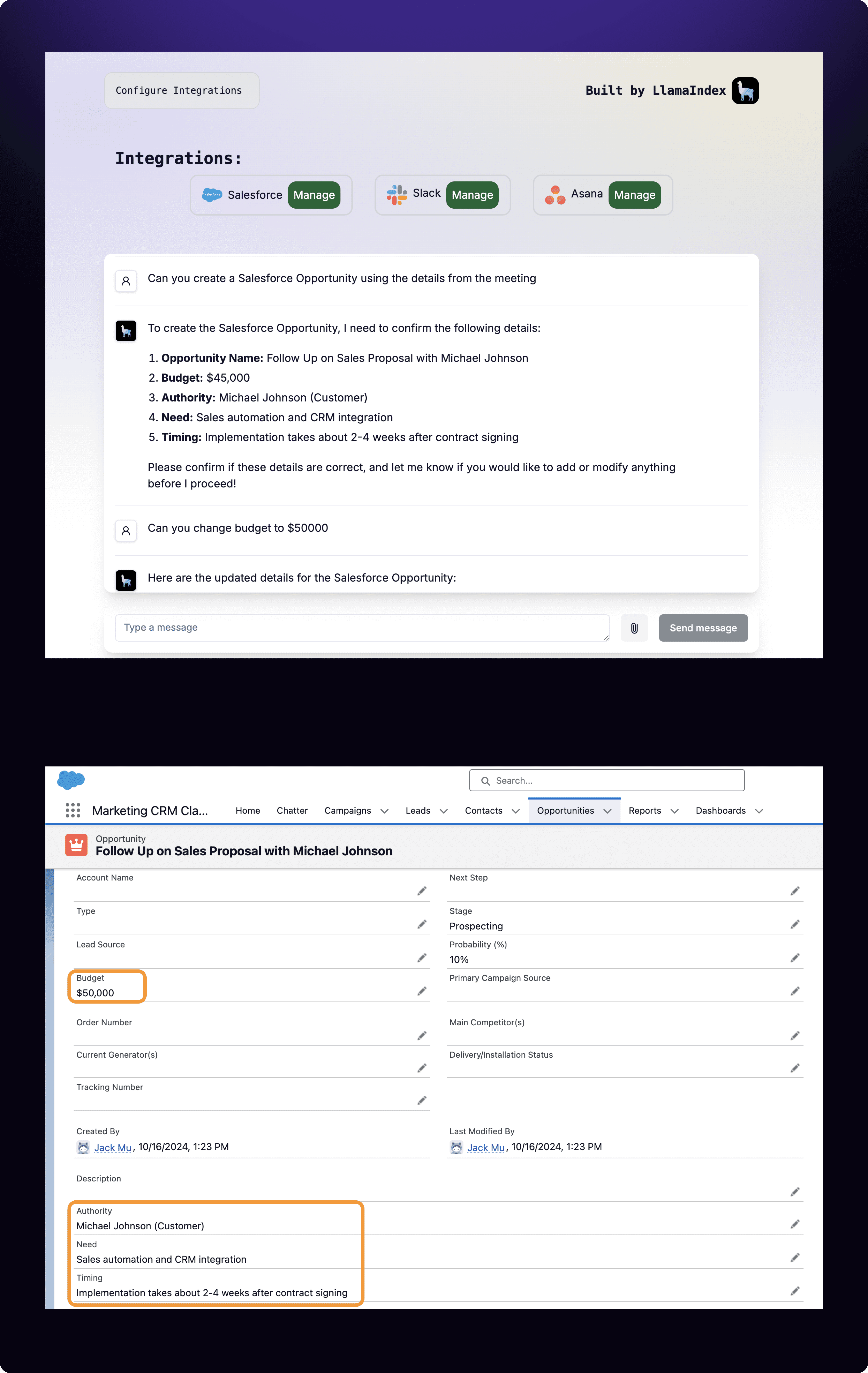 After the desired fields are mapped, we extrapolated information from the meeting transcript to create a Salesforce Opportunity, with the custom fields we wanted.