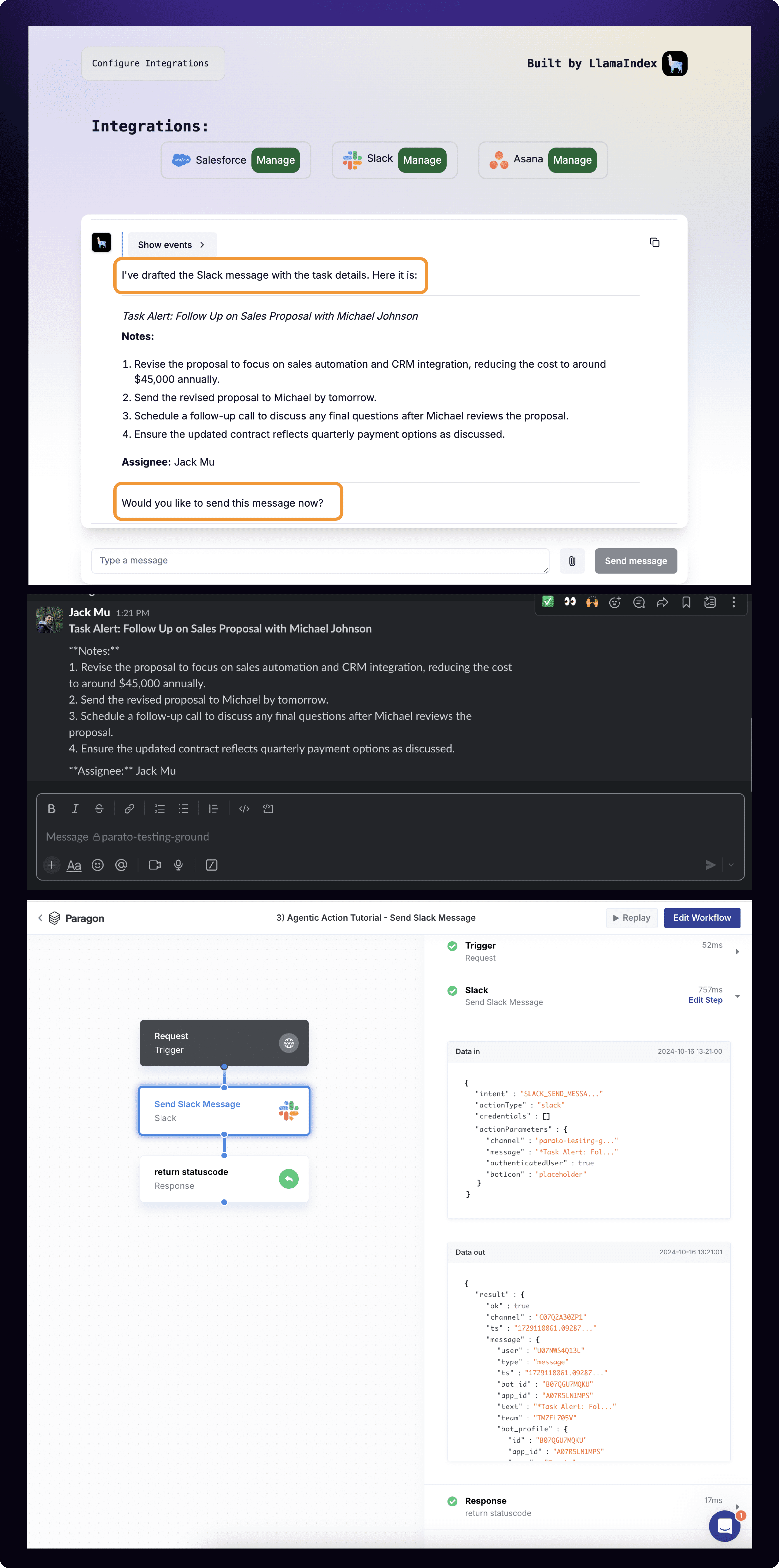 In the messaging use case, our AI meeting application was able to use context from the meeting transcript and send messages in Slack. In this example, we highlighted how guardrails can be implemented into an agentic action workflow by using a Human-in-the-Loop (HITL) process on the application side, and how Paragon can can again take care of integration specific details whether it’s Asana or Slack.