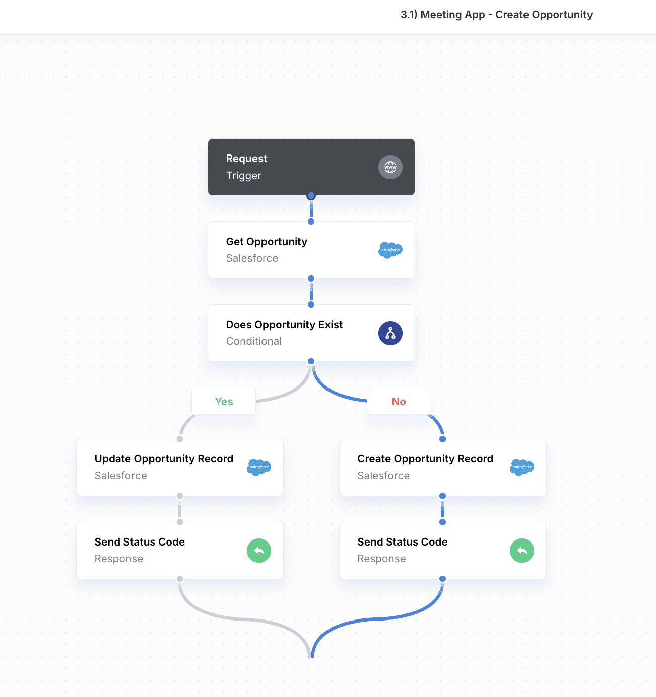 In our last example, we have a slightly more involved Paragon workflow that maintains data idempotency of our Salesforce objects. The workflow logic checks if the opportunity already exists, and updates the object if so.
