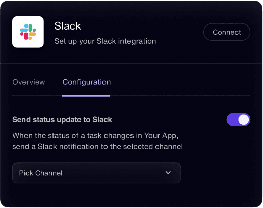 With single SDK call, provide your customers a self-serve integration authentication and configuration experience - embedded natively in your app.