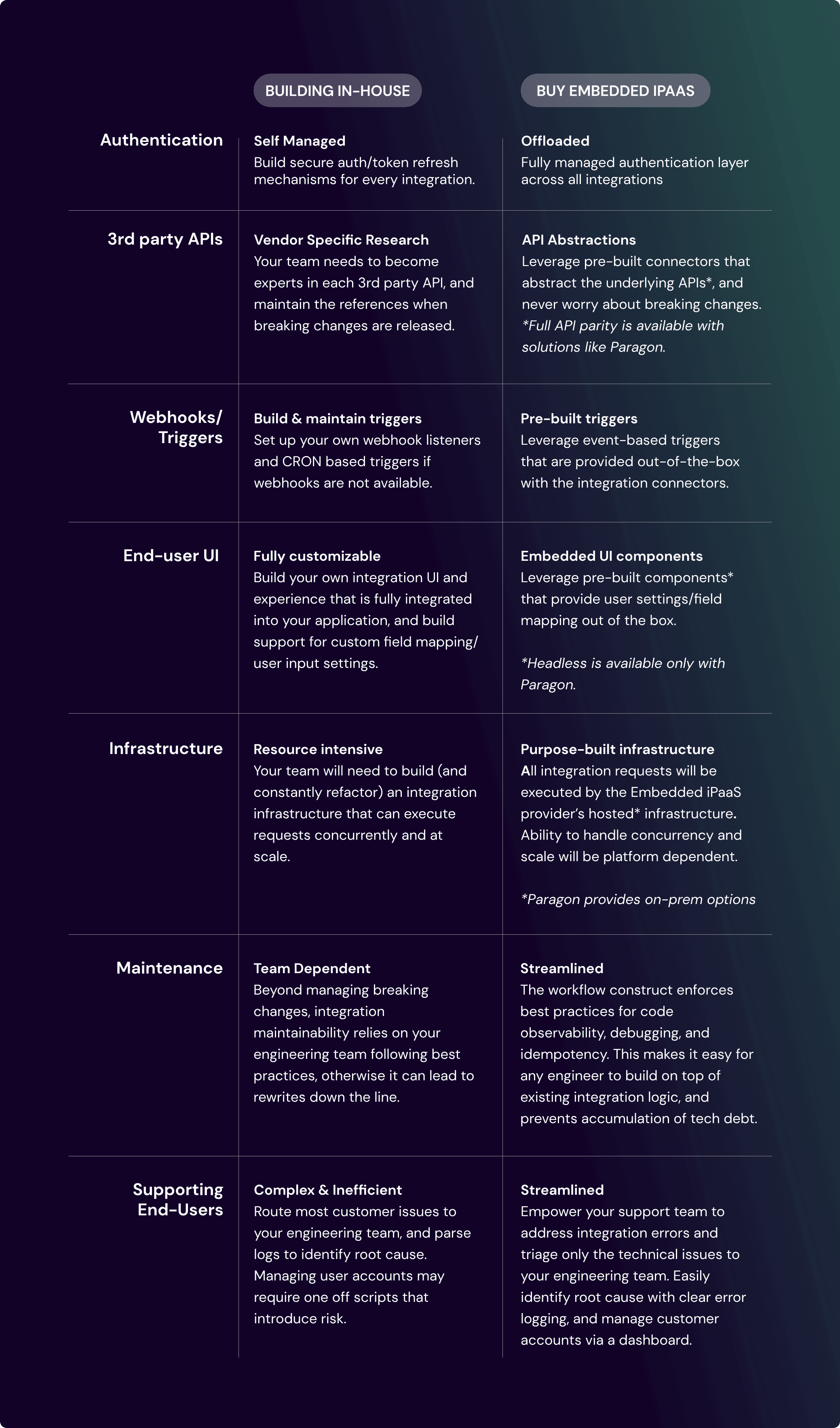 That's why many SaaS companies have adopted Embedded iPaaS platforms like Paragon to help streamline the integration development process, so they can keep up with customers' demands. But buying an embedded platform is never an easy decision, and as developers ourselves, we know the urge to build everything yourself rather than use ready-made, off-the-shelf solutions. That's why this guide will walk you through all the factors your engineering team needs to consider when making a build vs. buy decision for your native integration strategy.