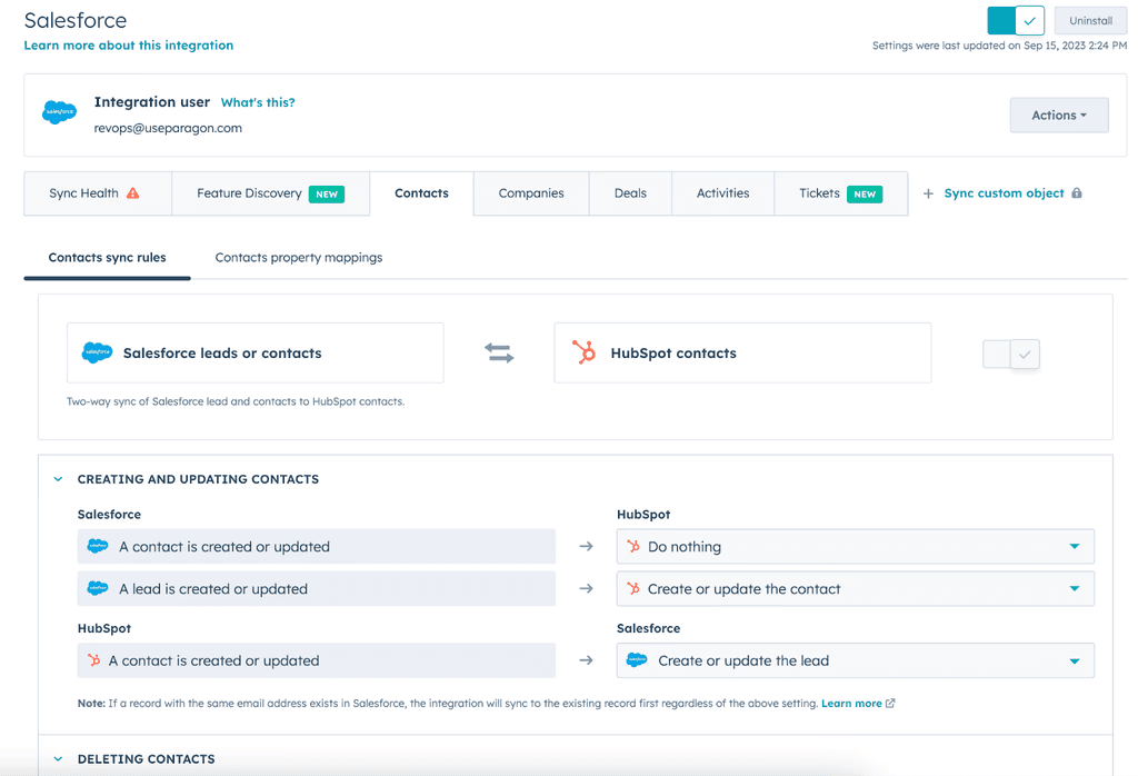 Here’s an example of HubSpot’s Salesforce integration, which contains an incredibly sophisticated integration settings experience that may be very difficult to achieve with pre-built solutions.