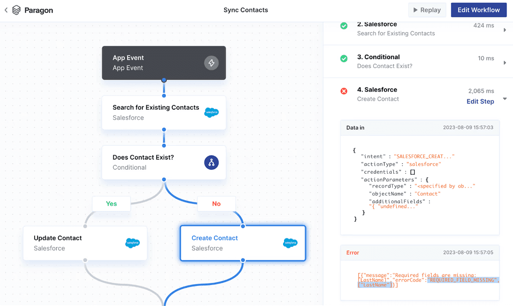 Embedded iPaaS platforms like Paragon streamline the debugging and support experience by providing a suite of monitoring & observability tools, such as a log of workflow executions that surface where errors have occurred, and for which customers.