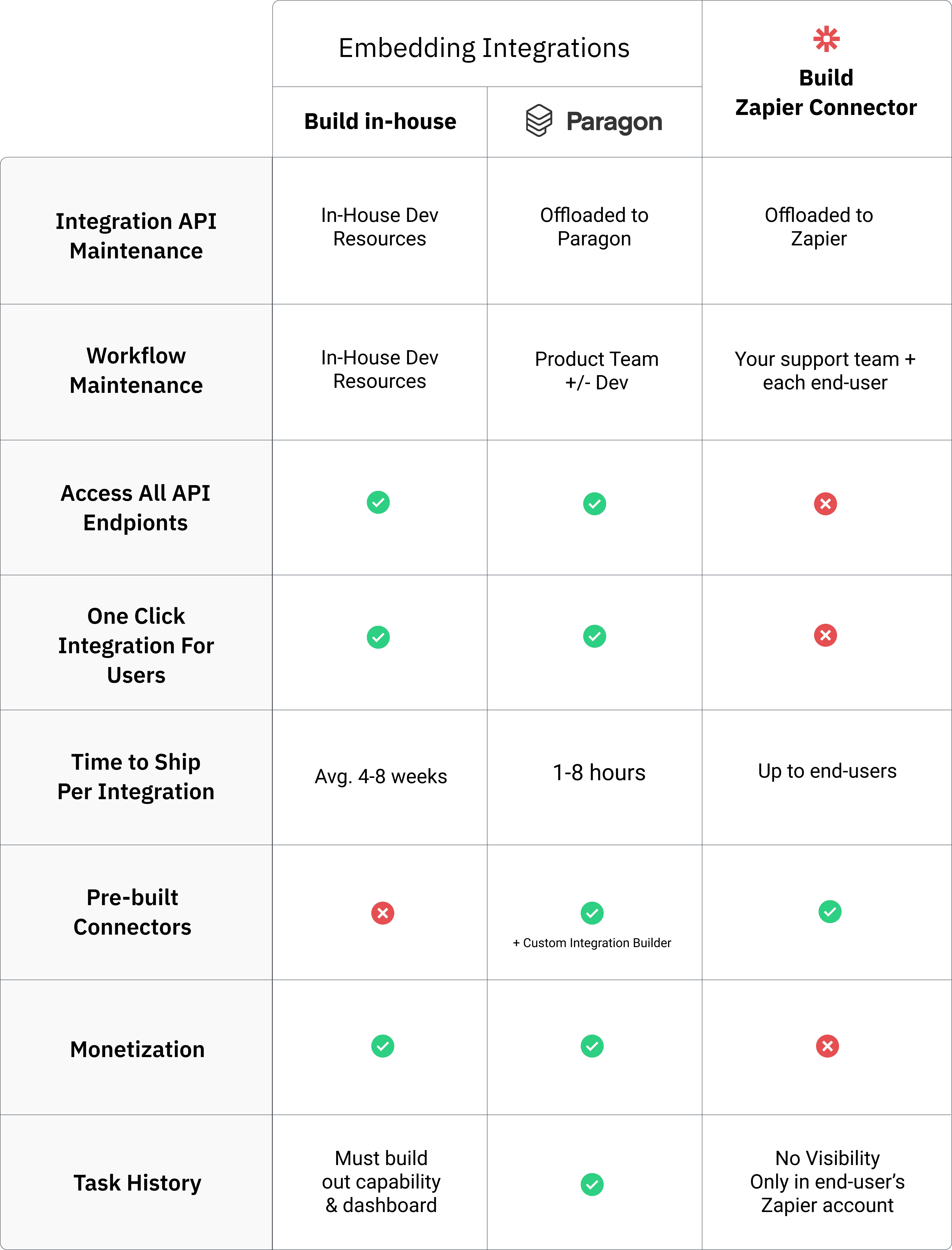 Despite the obvious benefits of embedding integrations natively in your app, in recent years, many companies have still opted to build Zapier connectors as a way to address the swarm of integration requests from their prospects and customers, simply because they couldn’t afford to allocate 6-8 weeks of engineering per integration. Frankly, if embedded integration platforms like Paragon didn’t exist in the market, this was a logical decision. However, this brings us to our final point - the onset of embedded integration platforms.