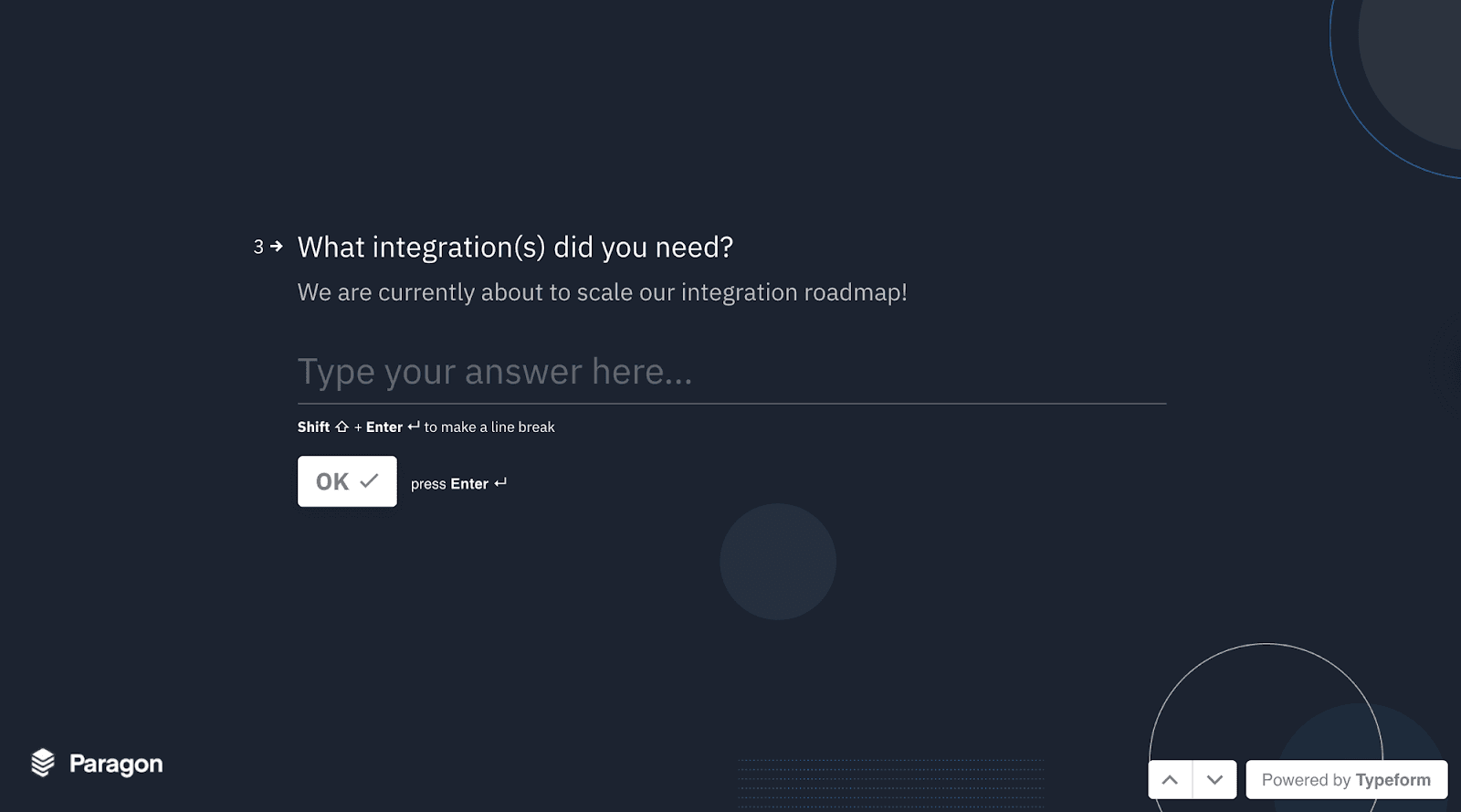 If the user picks ‘Integrations’ as one of the options, using conditional logic, you can follow up with a question of which integrations they needed.