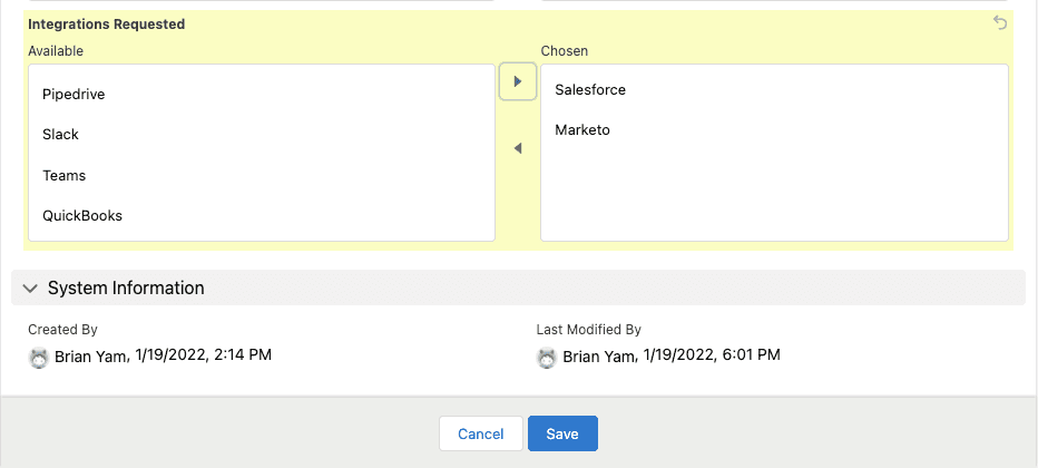 1. Create a multi-select dropdown of a list of integrations. If any new integrations come up, notify sales operations to add it to the list.