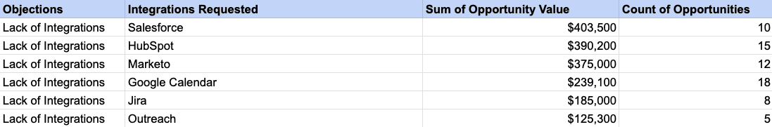 Next, build a report within your CRM (or export the data) that pulls in every opportunity involving an integration request, alongside the opportunity value. This will allow you to see how much potential revenue is being negatively impacted due to the lack of the integration.