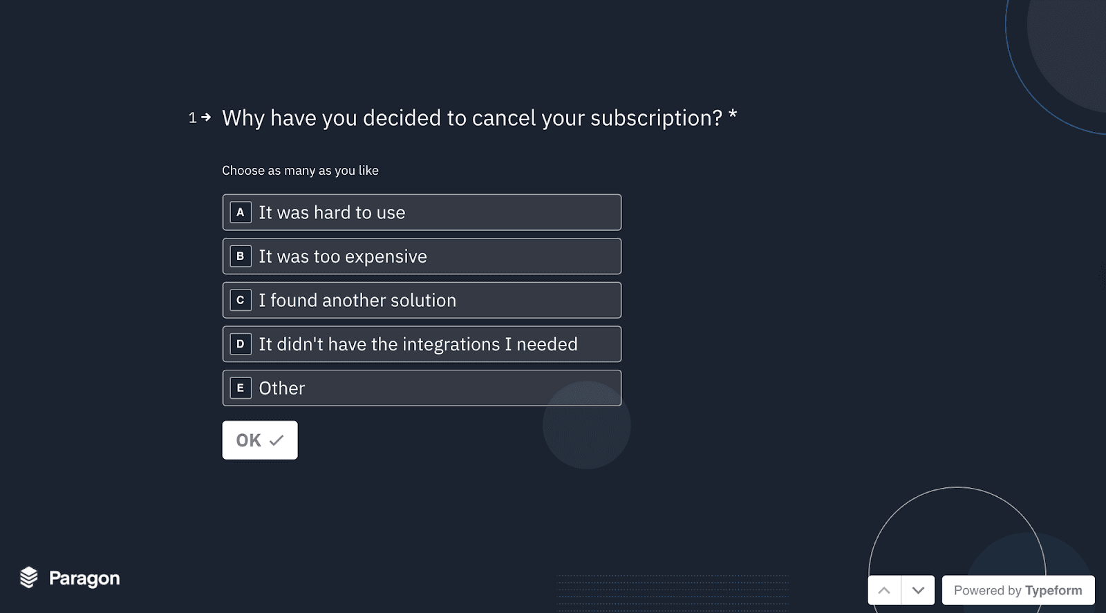 As part of the churn survey, prompt your users to answer the question ‘Why have you decided to cancel your subscription’ with a multi-select list of potential reasons.