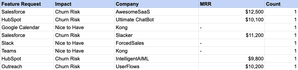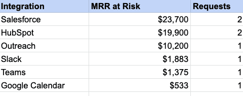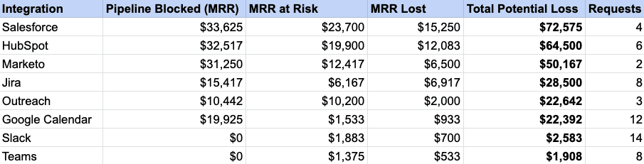 Another clear measure of business impact is the total MRR of customers that churned due to the lack of an integration.