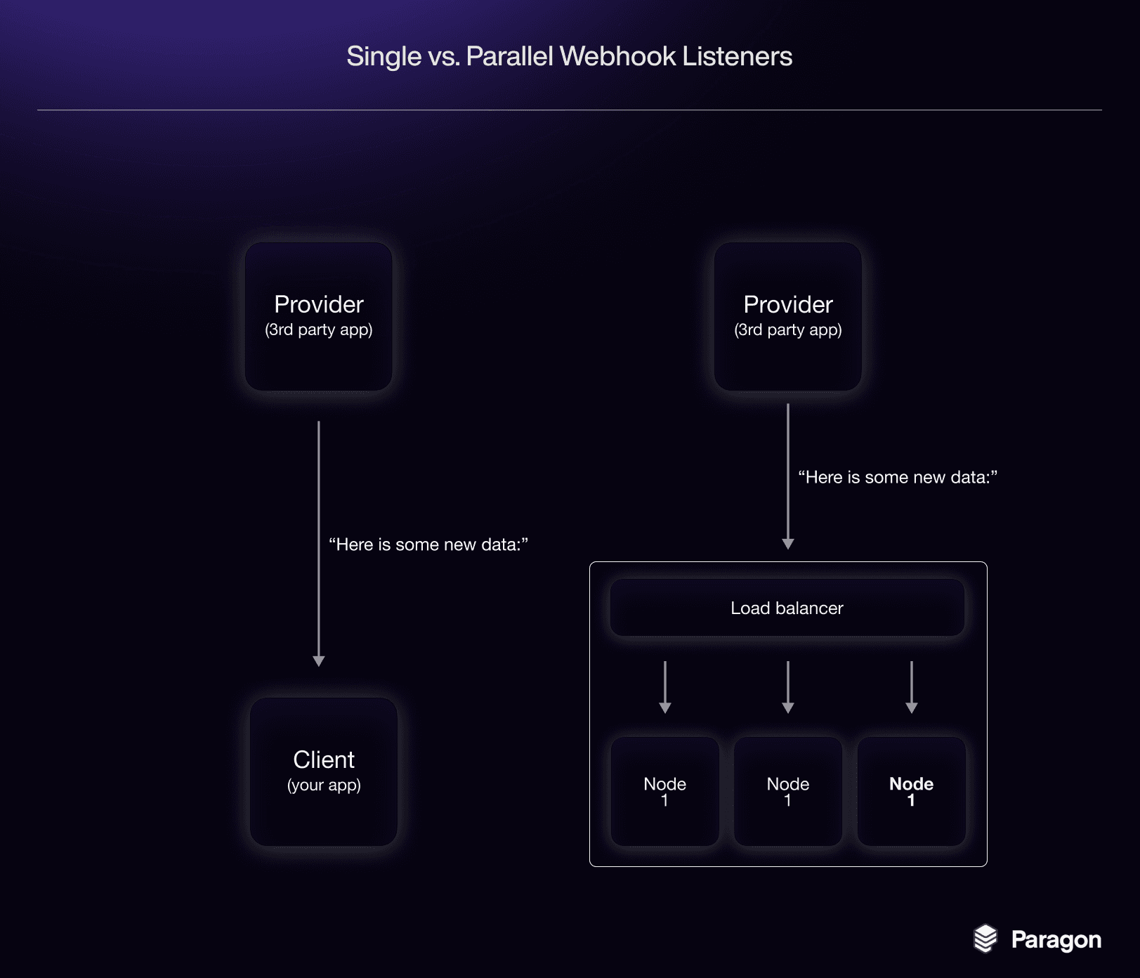 Because webhooks sometimes have to handle abundant traffic, they often need to be parallelized across instances to effectively scale. Otherwise, a single machine’s port would max out on connections available. Additionally, relying on a single deployment creates a single point of failure should it break; with high volume, this could lead to major data loss.