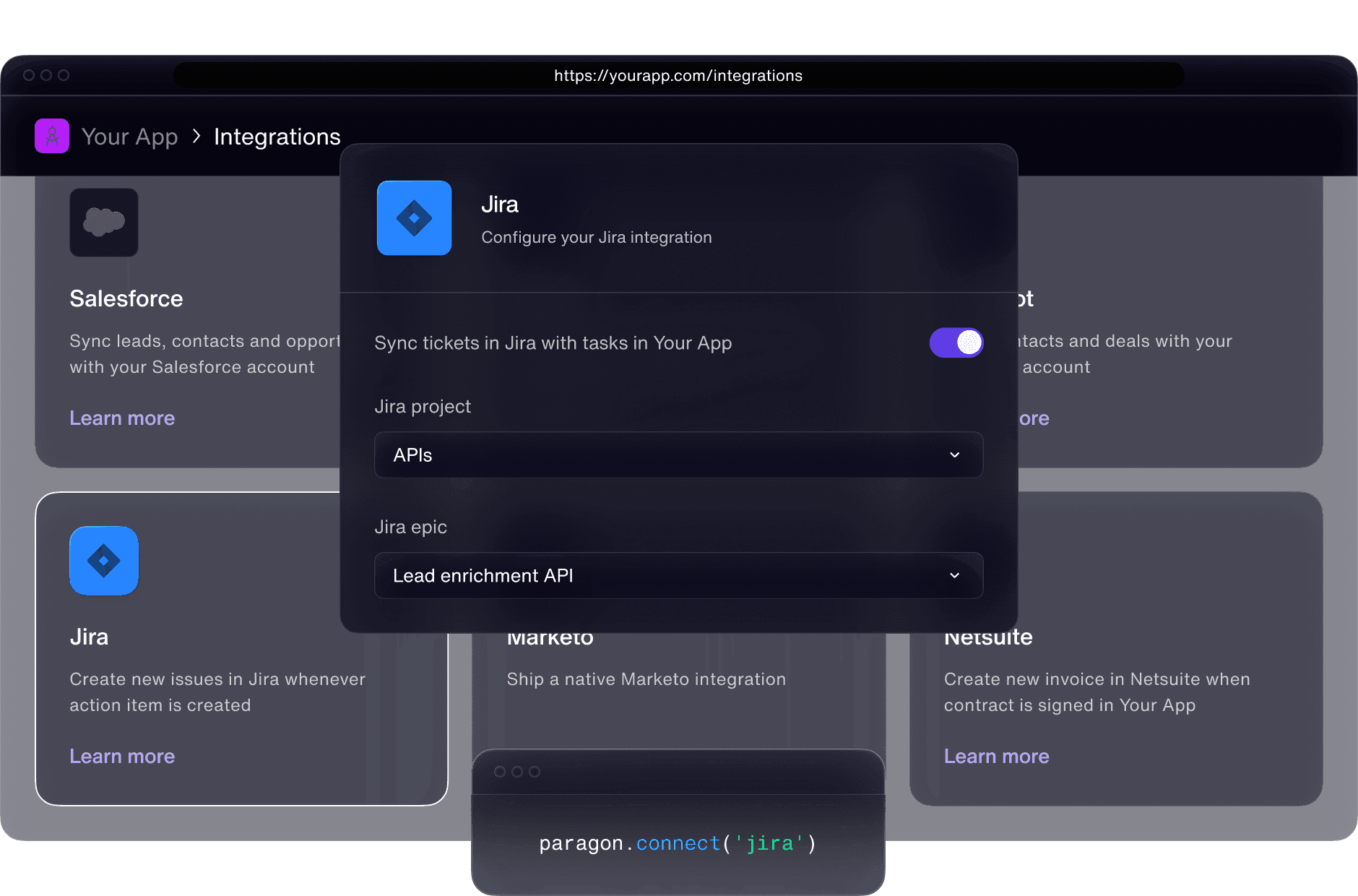 Embed an integration auth & config modal for every integration into your app, with a single line of code.