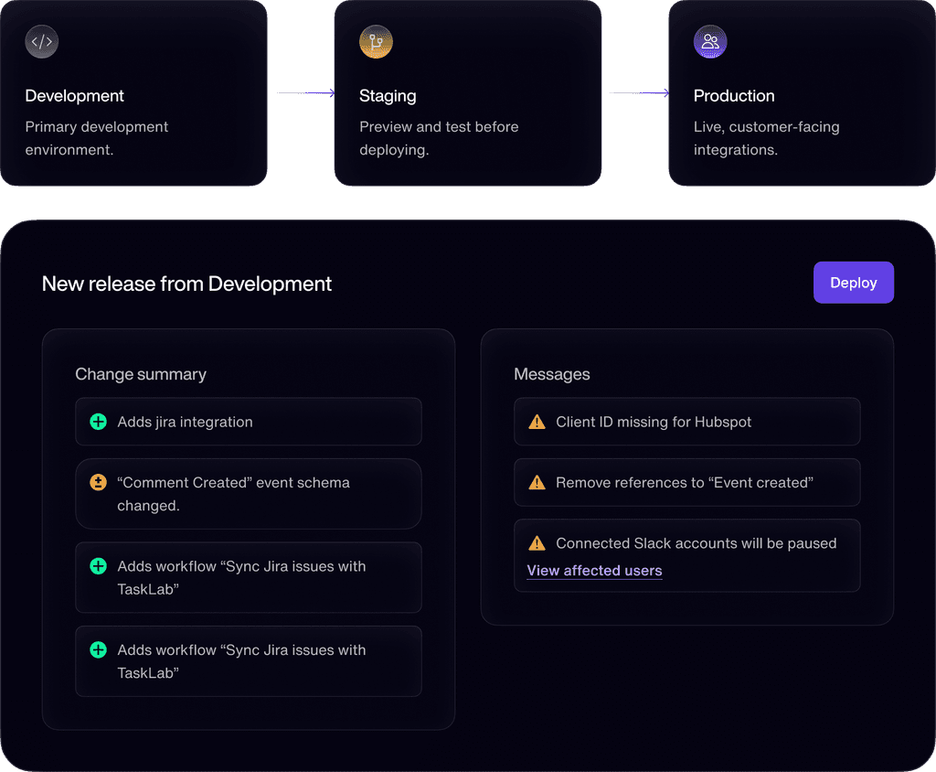 Create a release. Test, review, and deploy integrations confidently with Paragon’s release pipeline that highlights all changes and their potential impact on users.