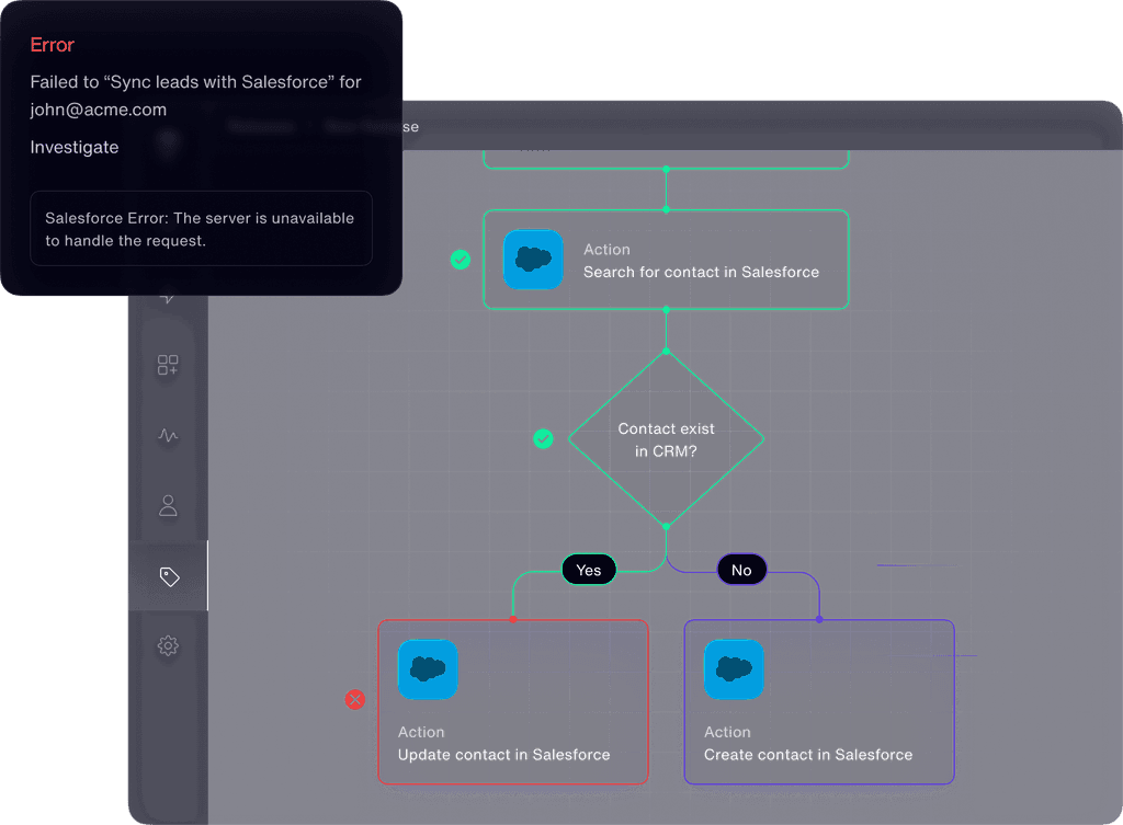 Monitor and debug. Errors are inevitable when there are dependencies on 3rd party APIs. Stream logs to your observability stack like DataDog, Sentry, and New Relic, and easily trace individual workflow executions.