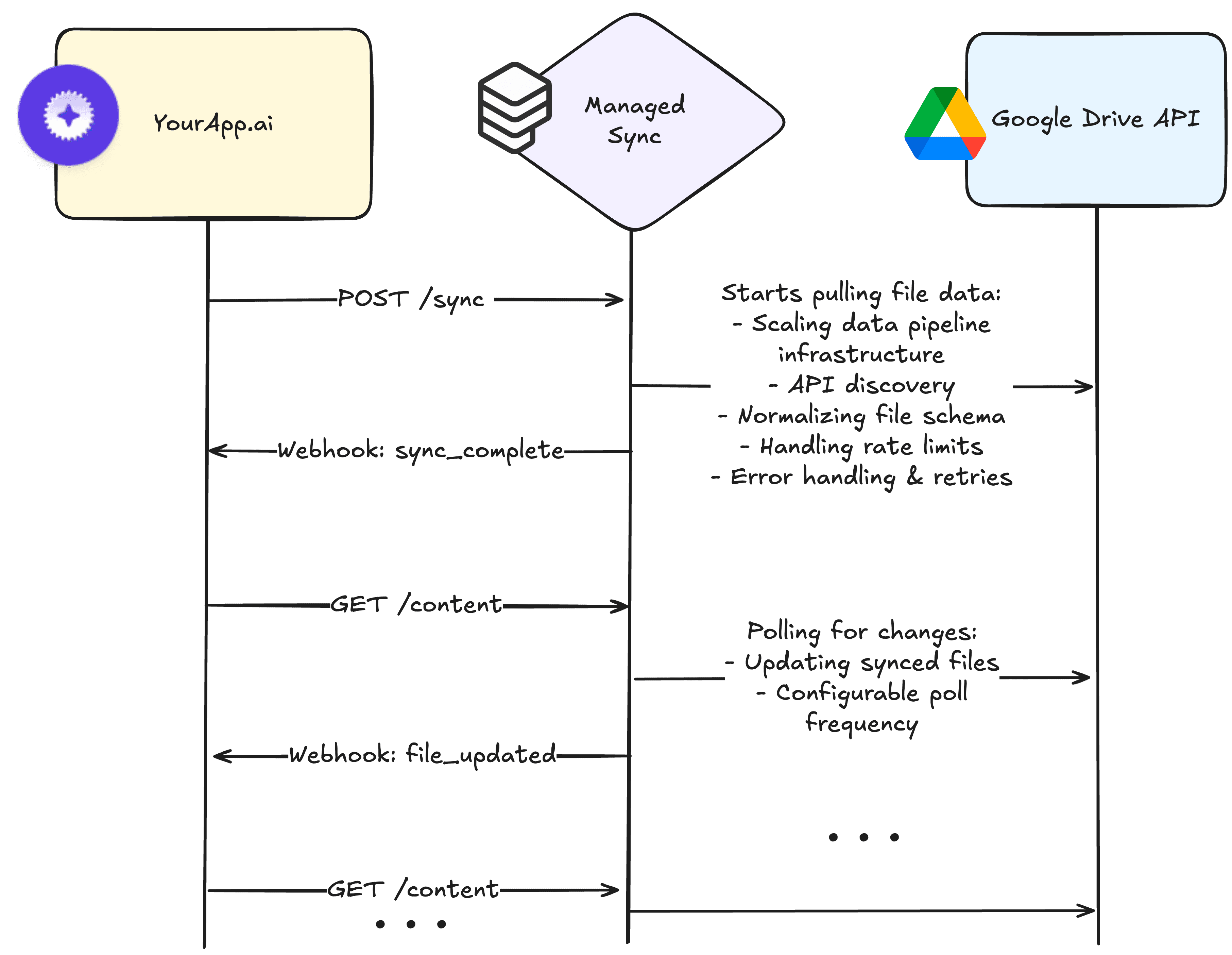 Notice how your application has no need to interact with the Google Drive API (or any of the file storage integrations) - learning what APIs you need, what rate limits they have, navigating file trees, learning different webhook authentication types, API specific errors, the list goes on. Managed Sync abstracts all of the API discovery and custom logic needed per file storage integration.
