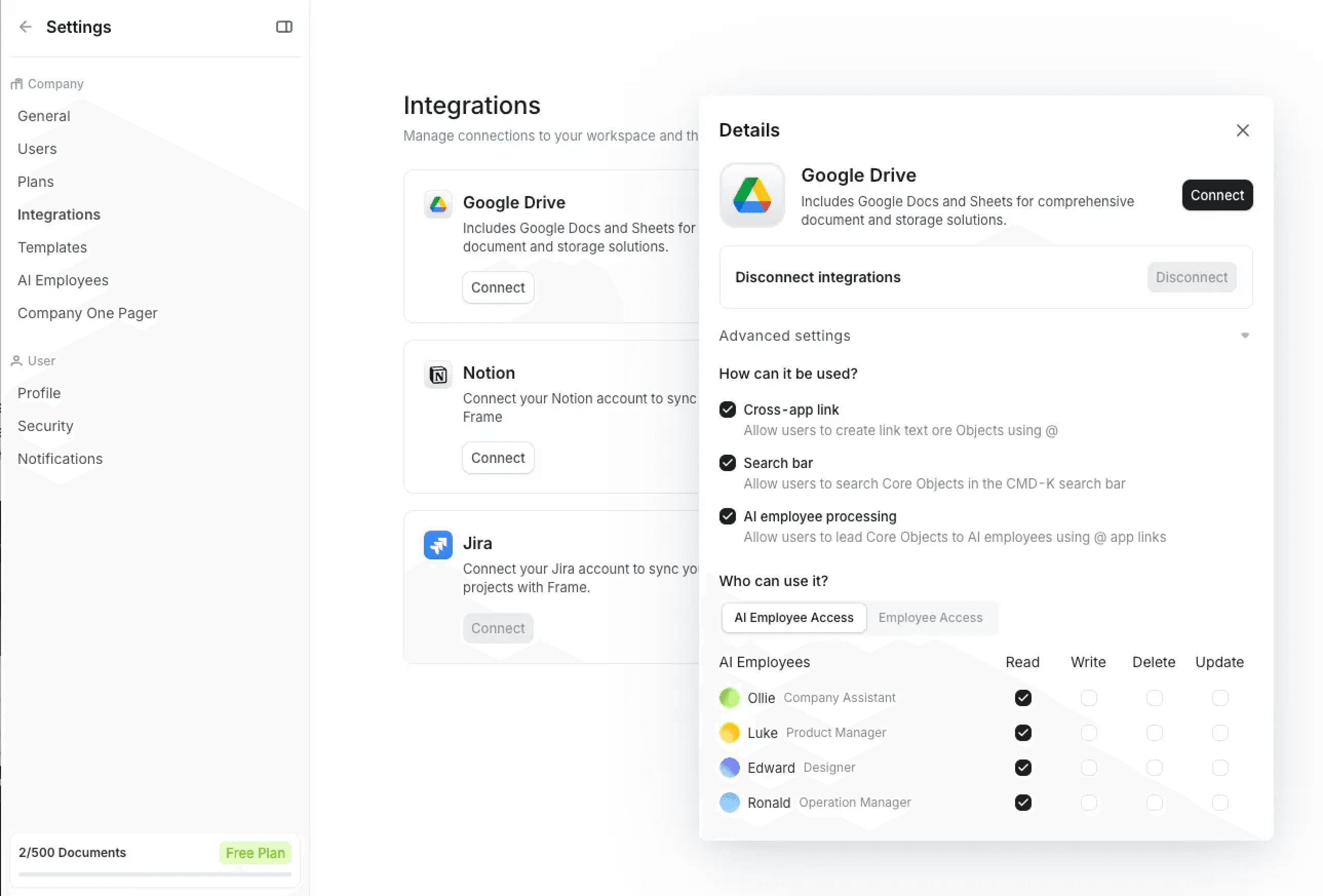 As Frame aimed to become the central nervous system for companies, so in order to go to market successfully, the team knew the needed to provide robust integrations to allow users to connect their external data seamlessly.
