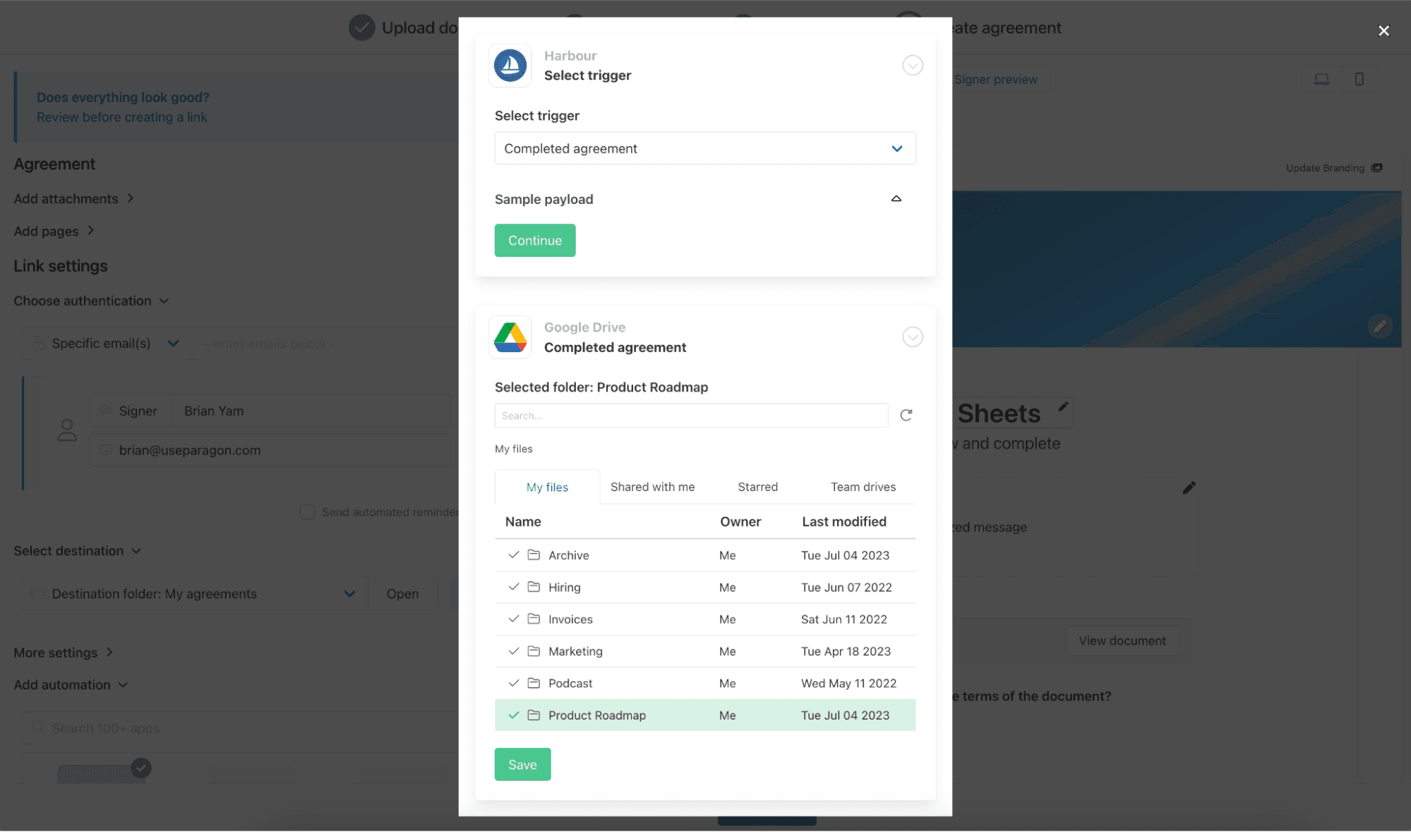 The Google Drive integration enables Harbour’s users to select any folder in their Google Drive account, and have contracts automatically uploaded to the destination once all signatures are collected.