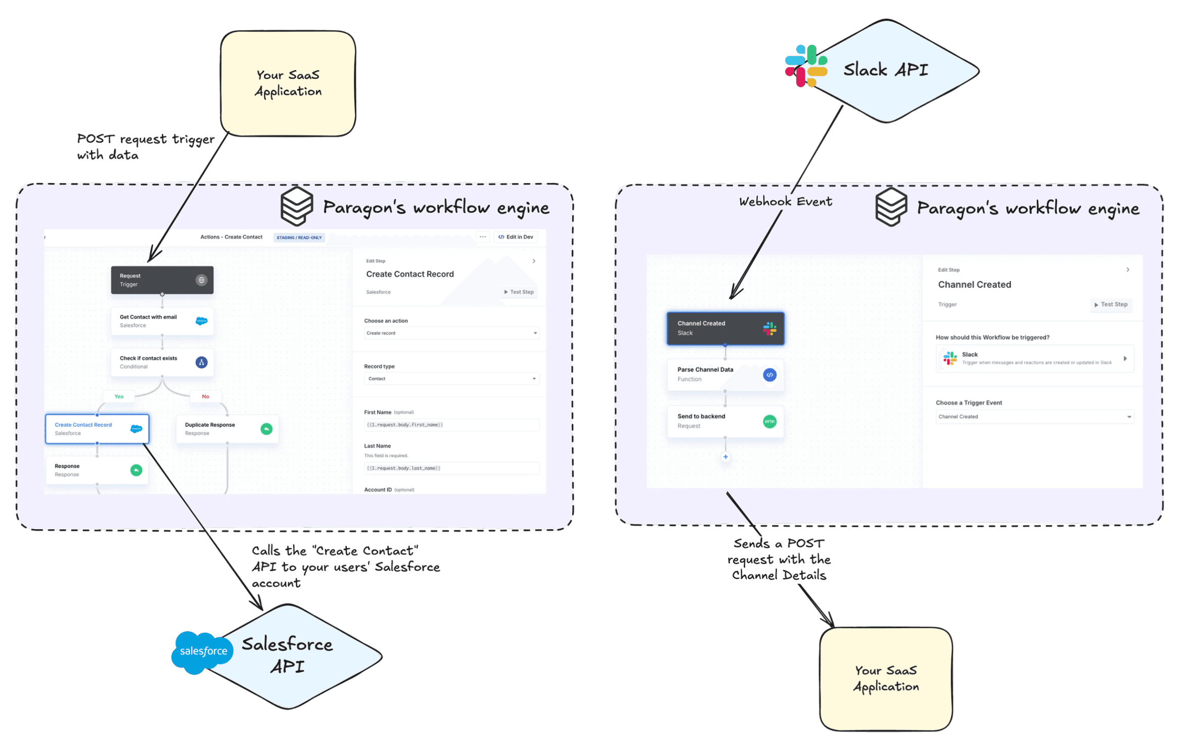 Paragon is an integrations platform that fits into the modern SaaS tech stack. Paragon's node.js SDK can slot into your frontend. Paragon's workflow engine can be a part of your backend, processing data between your application and 3rd-party APIs.