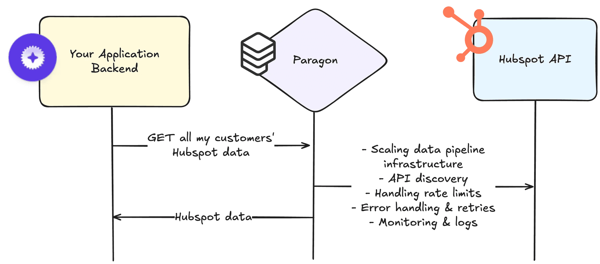 Paragon’s integration infrastructure then takes care of integration-specific details and scaling challenges to make working with 3rd-party APIs and data easy