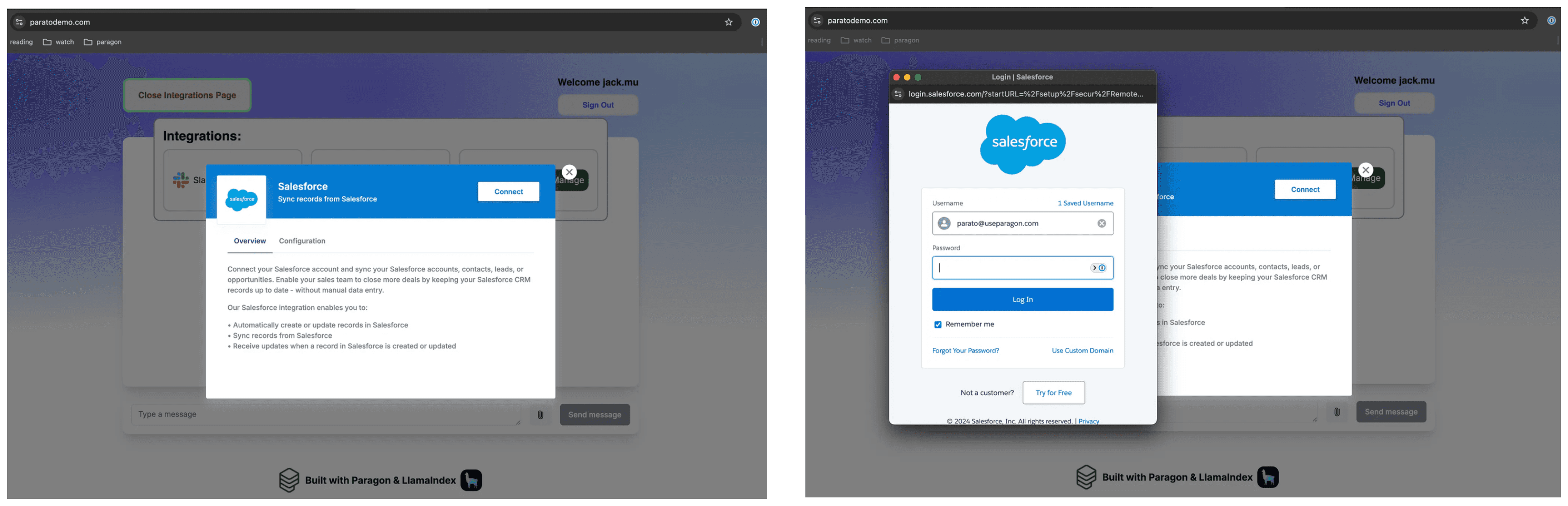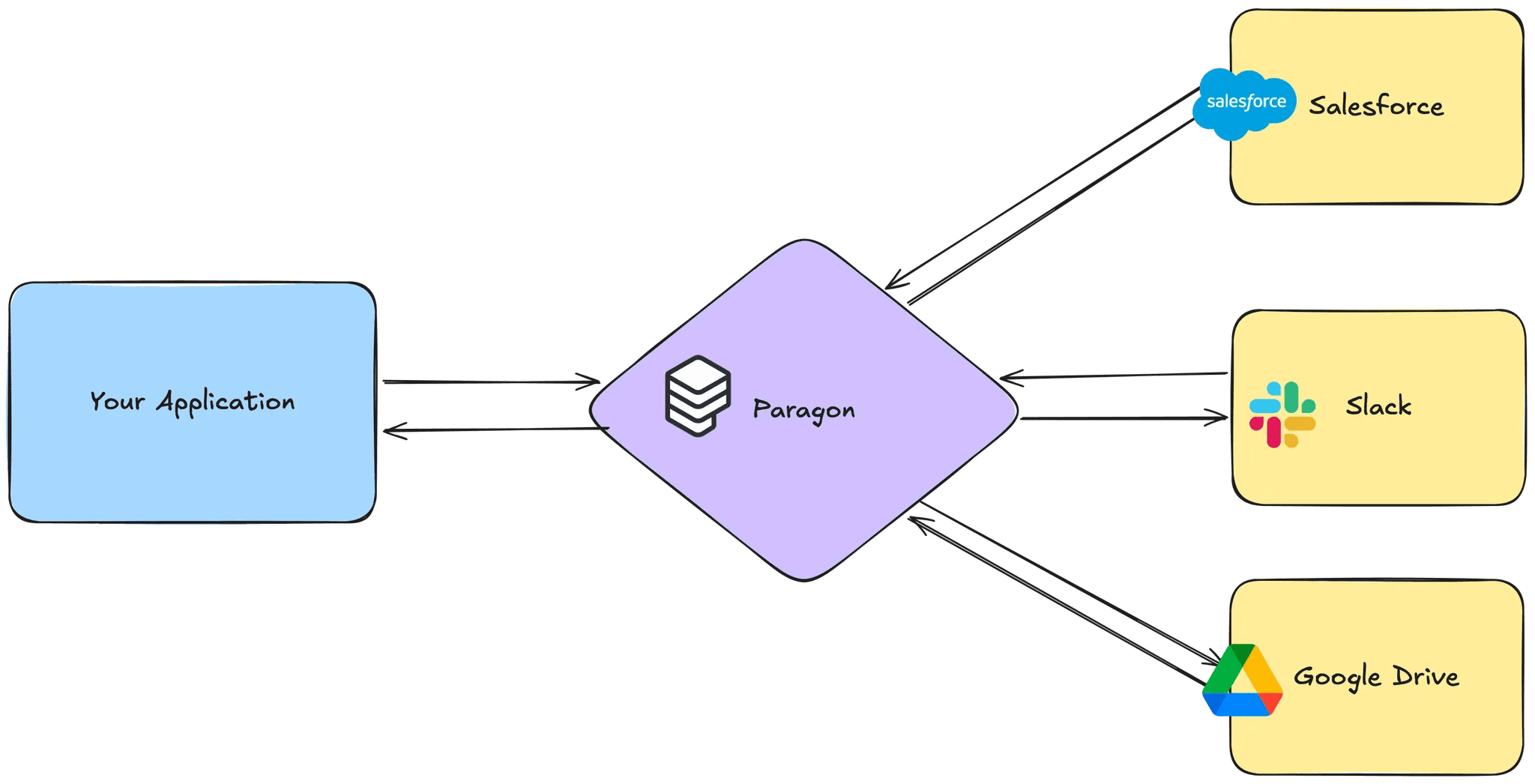Paragon is embedded natively in your application, where your users can use our connectors to connect to their 3rd-party platforms (their Salesforce, Slack, Google Drive, etc.) within your application