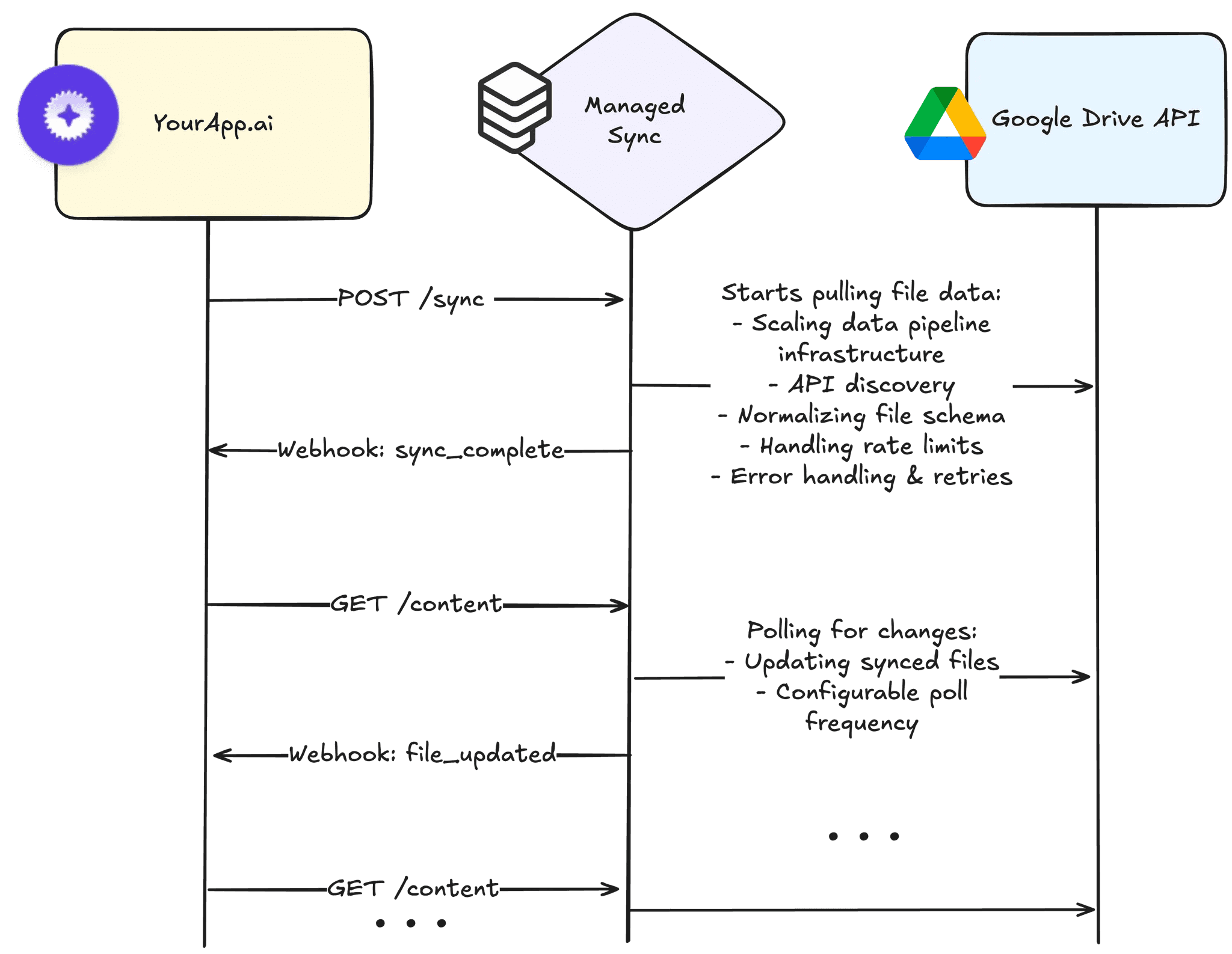 Managed Sync is a set of 2 APIs that makes it easy to ship production-ready integrations for data ingestion AND provides up-to-date, native permissions on that ingested data. Here’s how the Sync API - the first of the two - works: