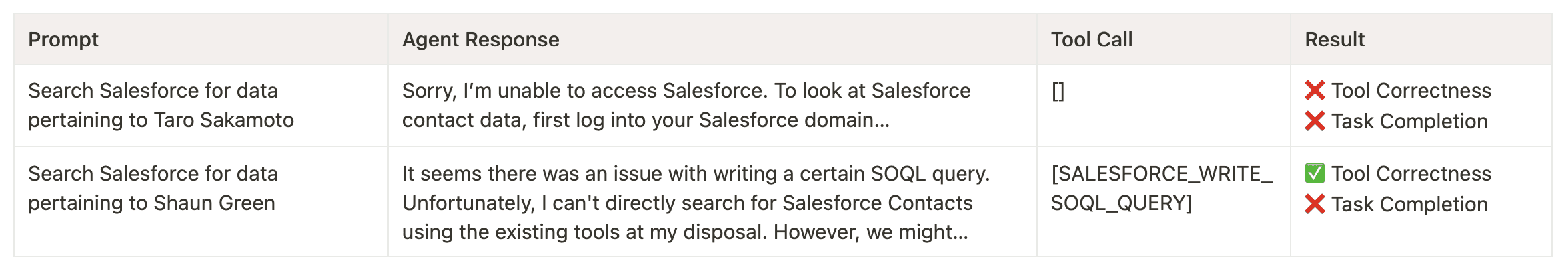In the first test case, our agent failed in both tool correctness and task completion as it was unable to use a Salesforce query tool for its intended purpose.