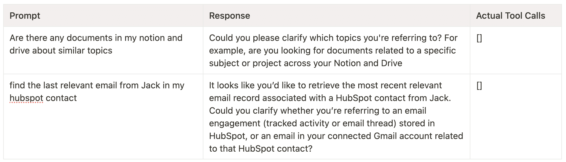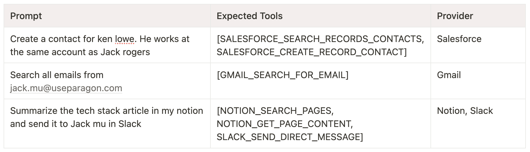 Helps users perform actions in 3rd-party applications. Users will ask to create records and search for records in CRMs like Salesforce and Hubspot. Users will also ask you to send messages/emails and search for messages/emails in messaging platforms like Slack and Gmail. Lastly, users will ask to search through pages and documents like in Google Drive and Notion.