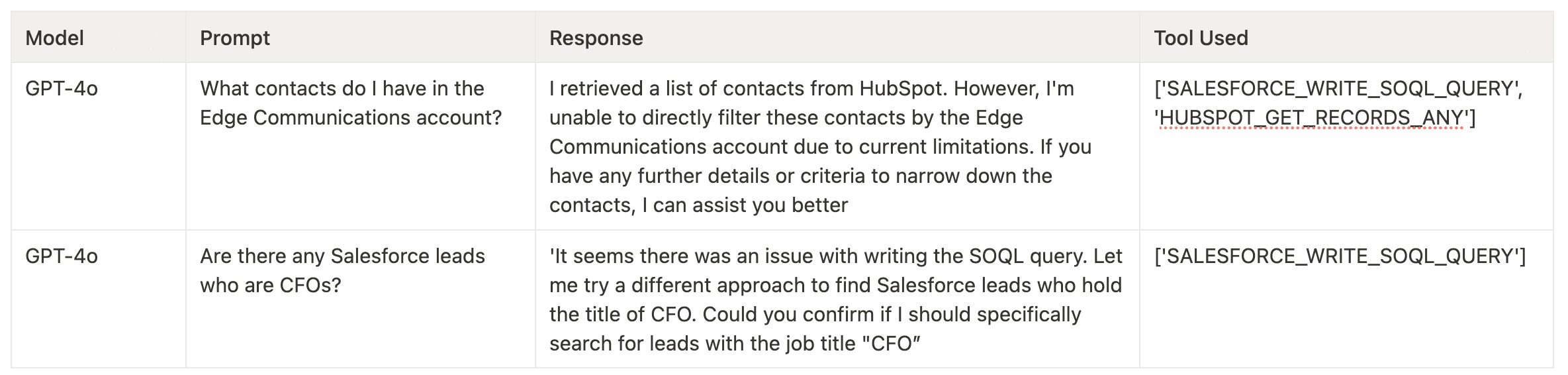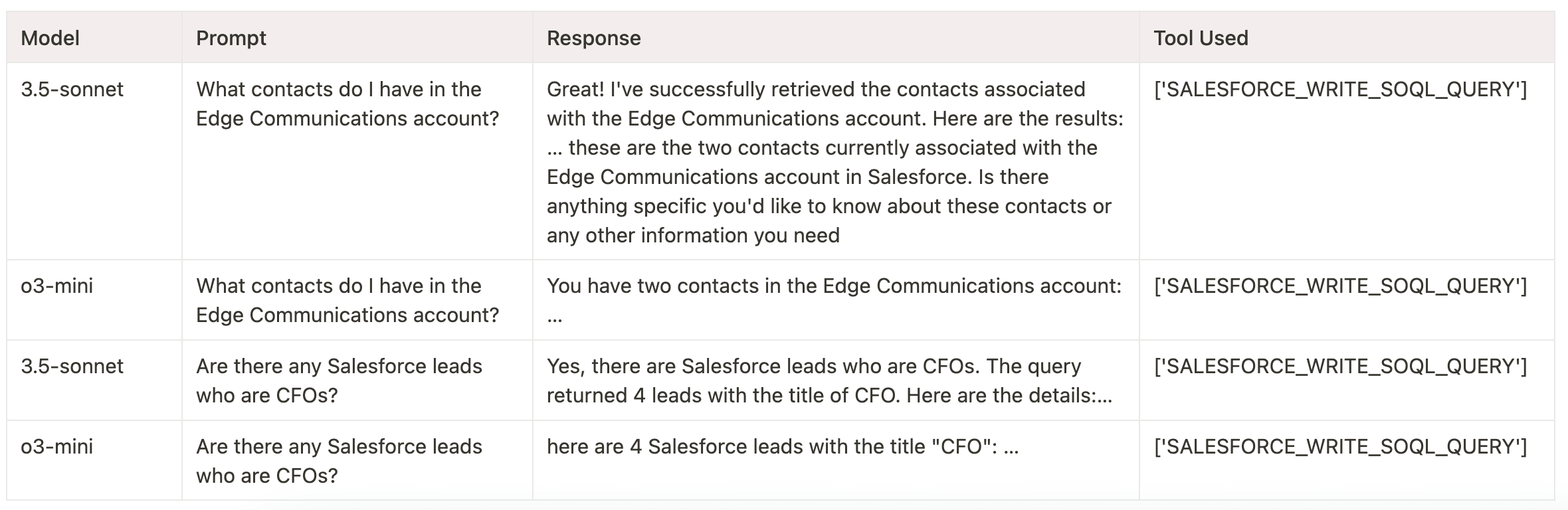 This is an interesting result because it signals that when 3.5-sonnet and o3-mini pick the right tool, they usually complete the task as well. While GPT-4o picks the right tool more often, it has trouble executing tasks properly. This was evident in test cases where GPT-4o needed to generate SQL.