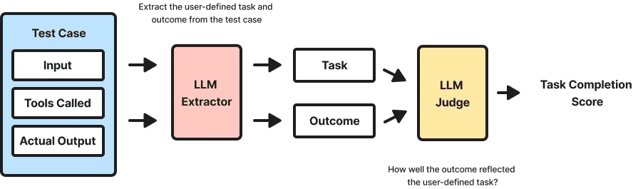 Task completion is an LLM scored metric that intakes an agent response, tool calls, tool inputs, tool outputs, and the original prompt to evaluate if the intended task was completed.