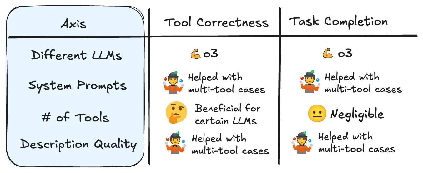 This signals is that grid searching where we try every combination of our axes - LLM, system prompts, architecture, and descriptions - is necessary to identify the best combination of settings to optimize tool performance.