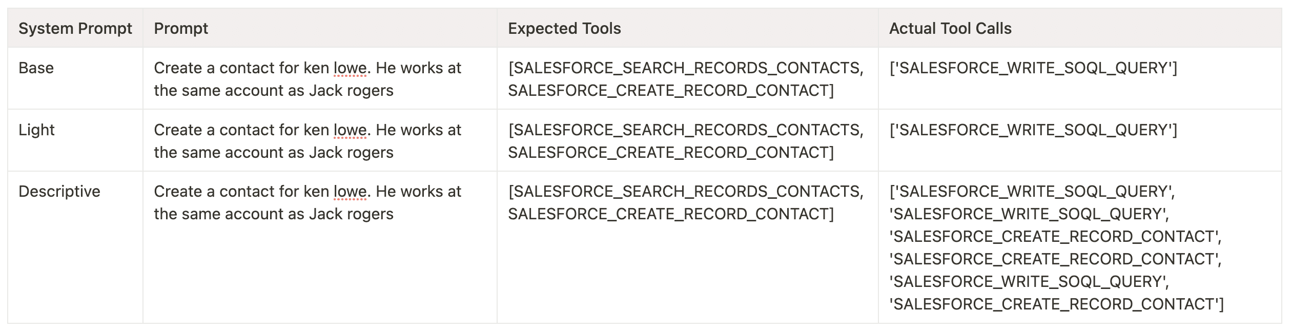 For more complex test cases, we see more of a positive impact with more descriptive system prompts. While the sample size for multi-tool test cases is smaller as it’s just a subset of our test cases, I was able to see that the more descriptive system prompted agents were more likely to try multiple tools. In the example below, we see that rules and examples can help agents try multiple tools and retry tools which is necessary for more complex use cases.