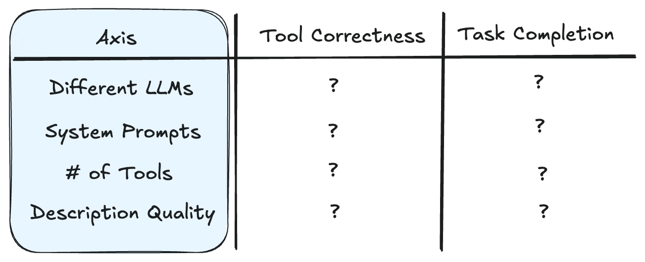 I mentioned that this research started as a series of questions which all boil down to how to improve tool calling performance. However, this question needs to be broken down to a series of sub-questions that make up our axes.