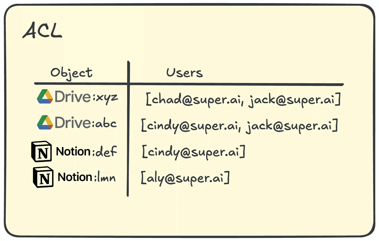 Where this permissions protocol differs from querying with tool calls and separate namespaces is that you would need a separate database for indexing and storing permissions. Just as integration providers provide APIs for pulling data, they’ll generally also provide an API to pull permissions.