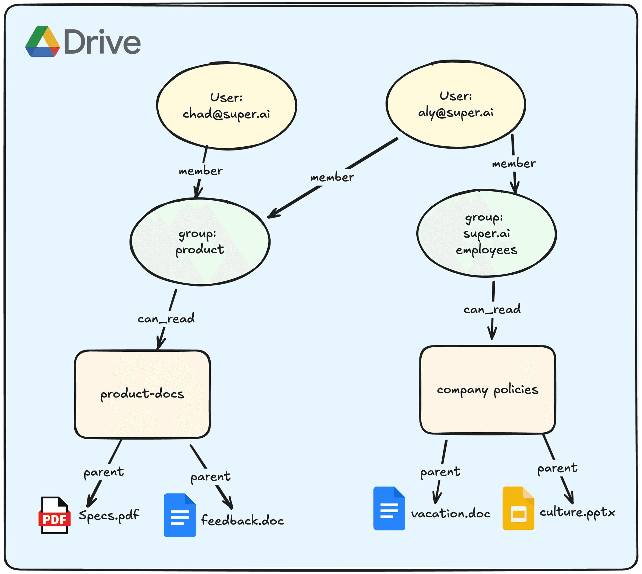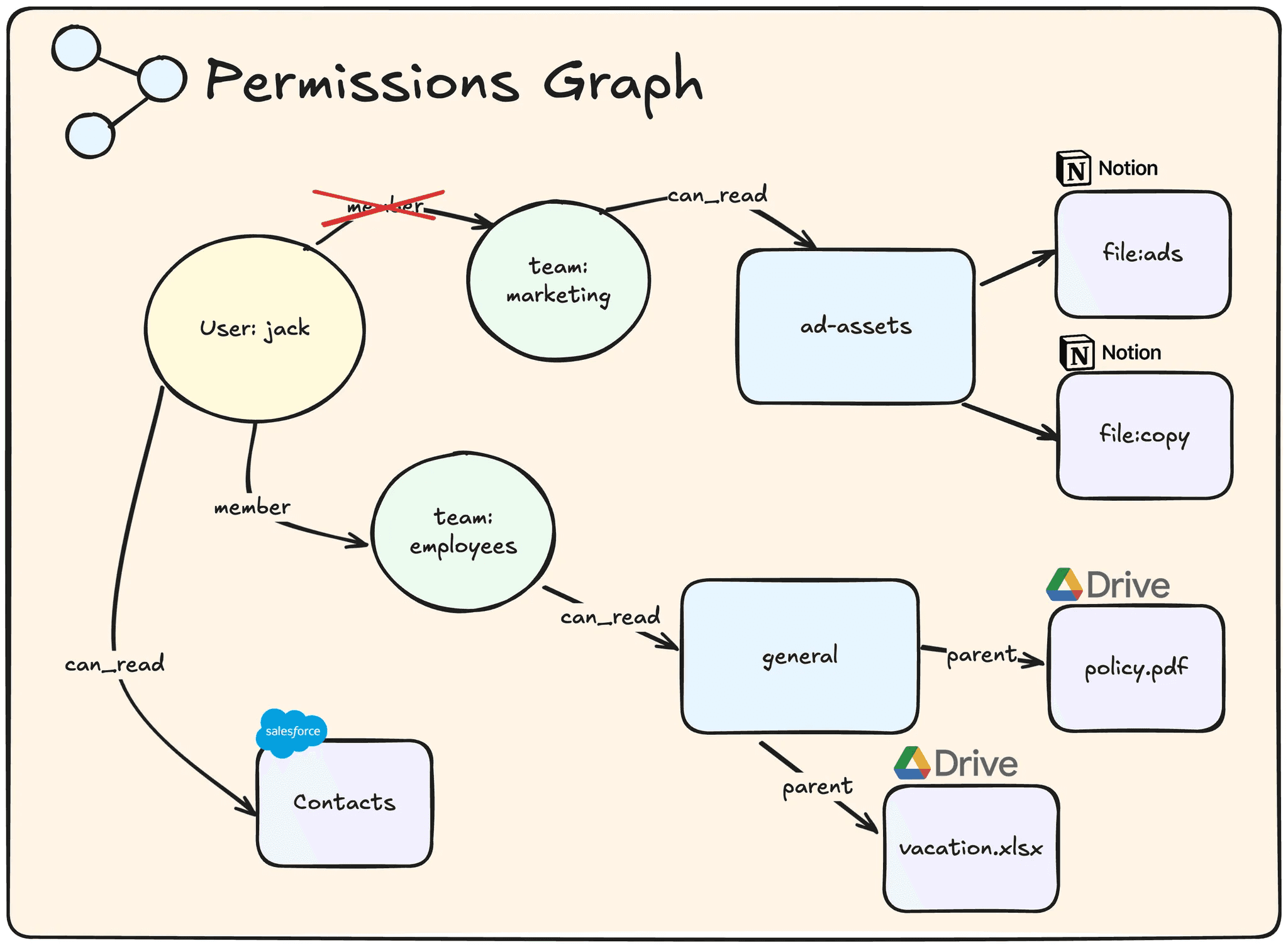 ReBAC stands for “Relationship Based Access Control.” Unlike using roles, attributes, or ACLs to propagate permissions, ReBAC defines relationships between users, teams, collections (folders), and objects (files). ReBAC has been proven to work across different different data sources, as seen in Google’s implementation of Zanzibar, Google’s global authorization system that they use across their products.