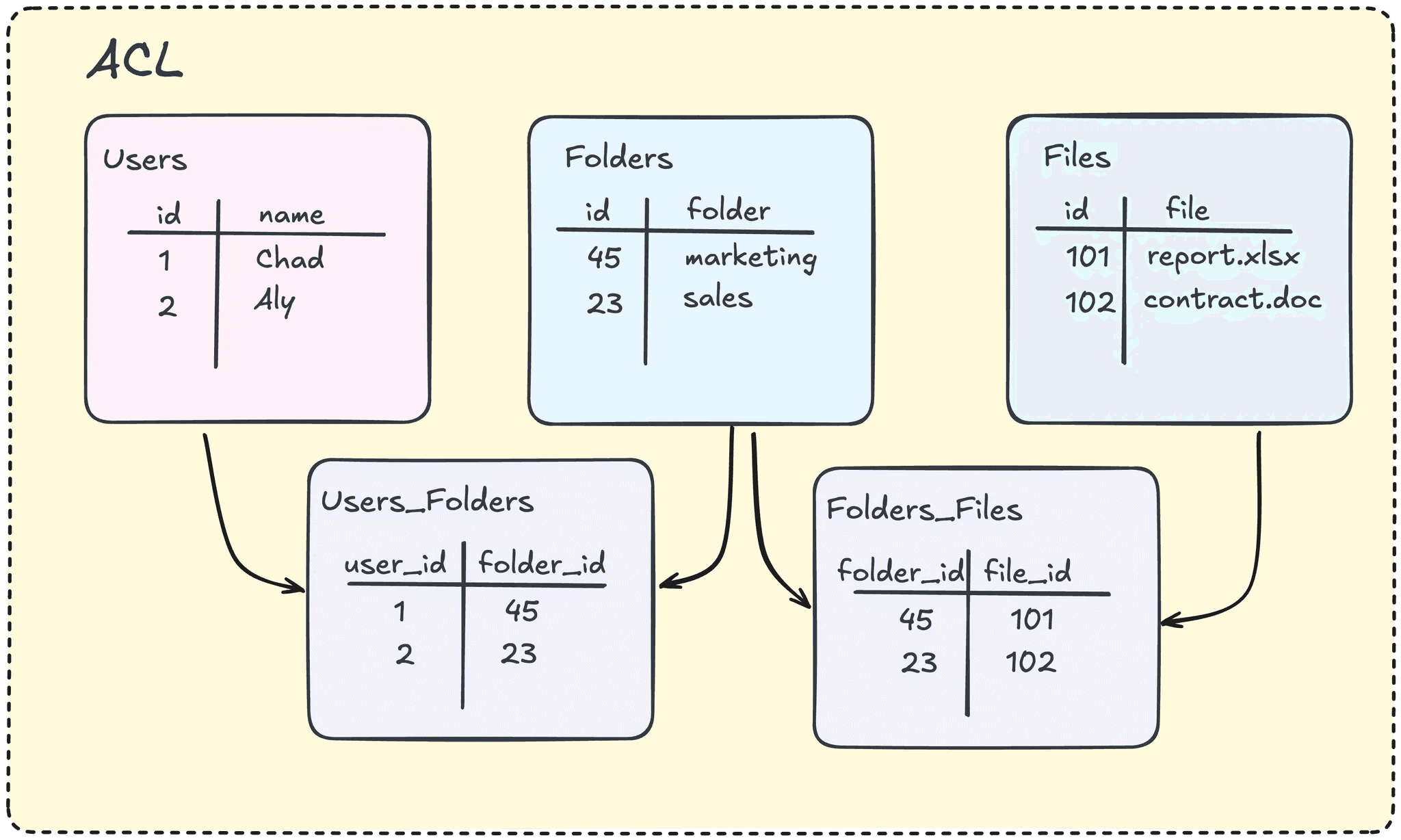 A different ACL model is using different tables to track relationships rather than "flattening" hierarchical structures. For example, you could have a users table, teams table, folders table, file table, and separate tables tracking relationships - users_teams table, users_folders table, users_file table, etc. With this ACL model, writes are efficient. In our example with the Sharepoint folder permissions change, rather than have multiple rows updated, we only need to update a single row in the users_folder table.