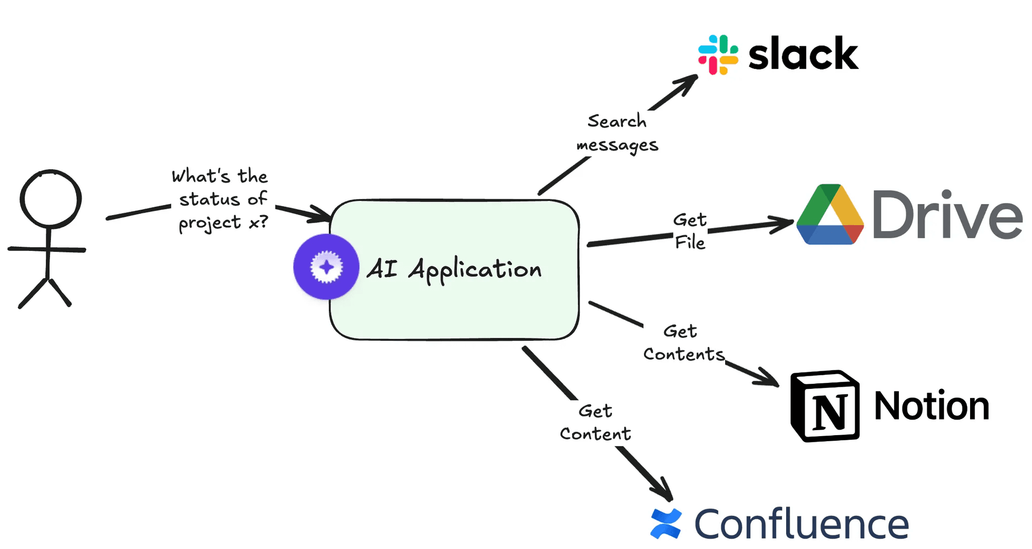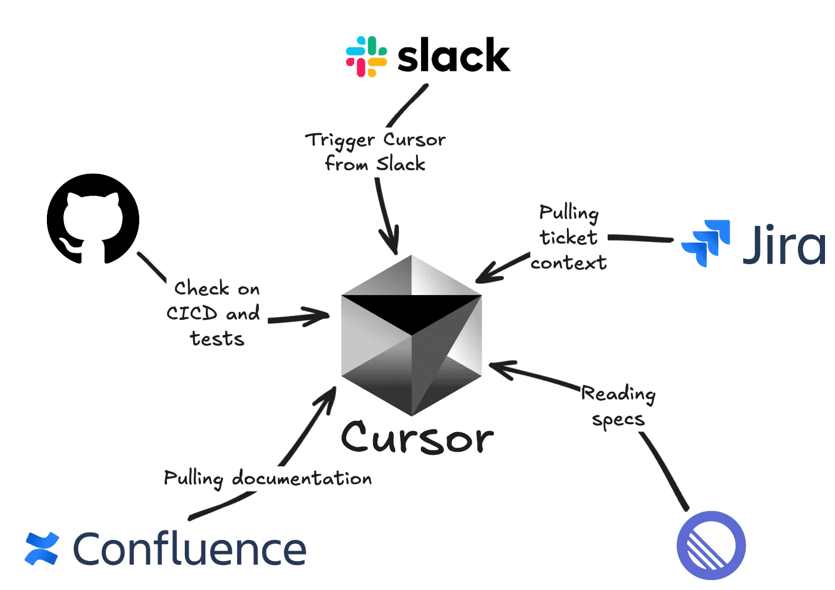 A quick example: Cursor - the AI code editor - has built integrations with Slack and Github, bringing Cursor features to the platforms their users are in. We can imagine a world where Cursor builds even more integrations: Jira, Confluence, Linear, and other platforms where engineers work. These integrations would allow Cursor to understand their users’ work better (RAG) and perform work in those platforms (tool calling).