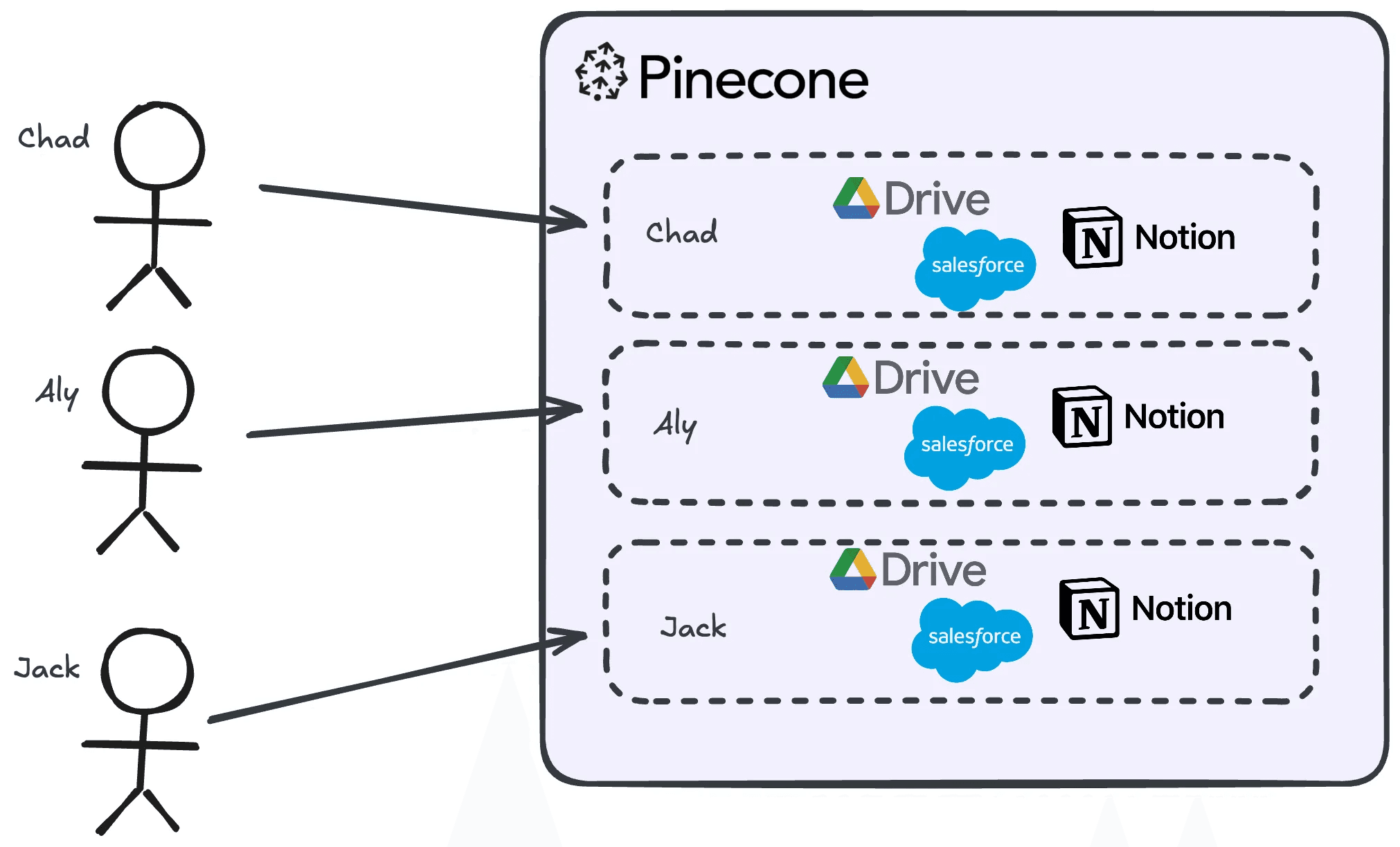 Unlike the previous namespaces approach, you don’t need a separate namespace per end-user. Even with enterprise customers, when an admin enables data ingestion from their organization's file storage or CRM systems, your RAG application can put the chunked vector embeddings in a single database/namespace, simplifying the data ingestion process.