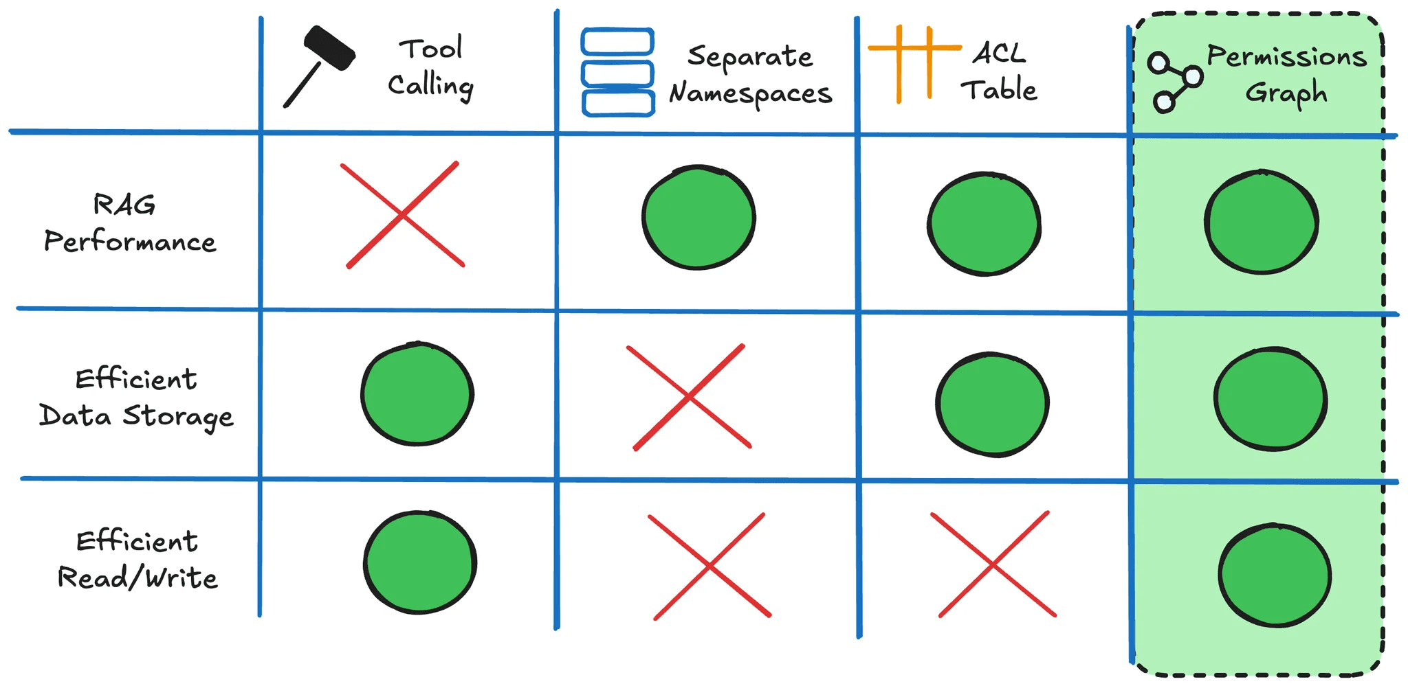Where this relationship-based model falls short is on reads. The more relationships there are, the more joins are needed whenever your RAG application queries the permissions ACL table.