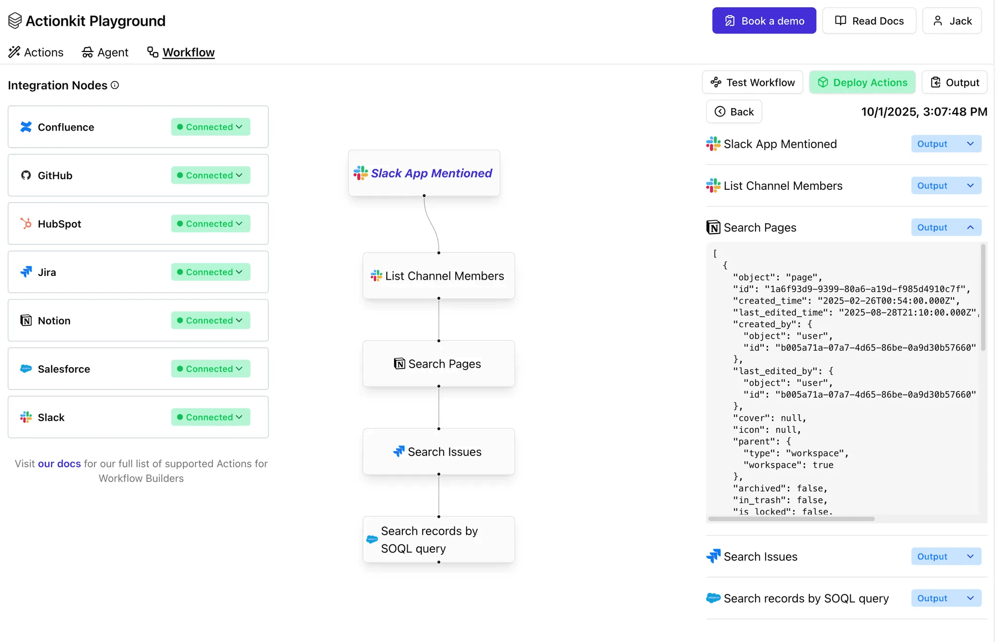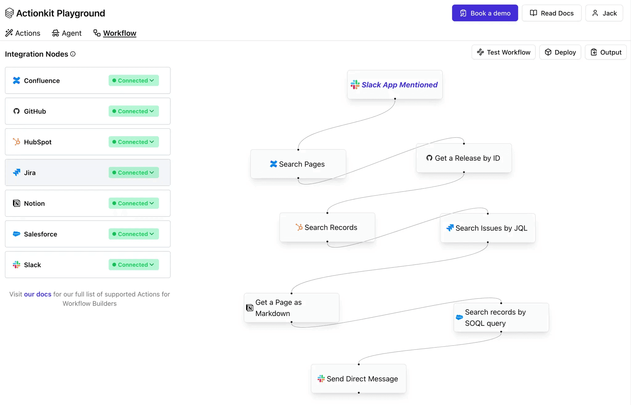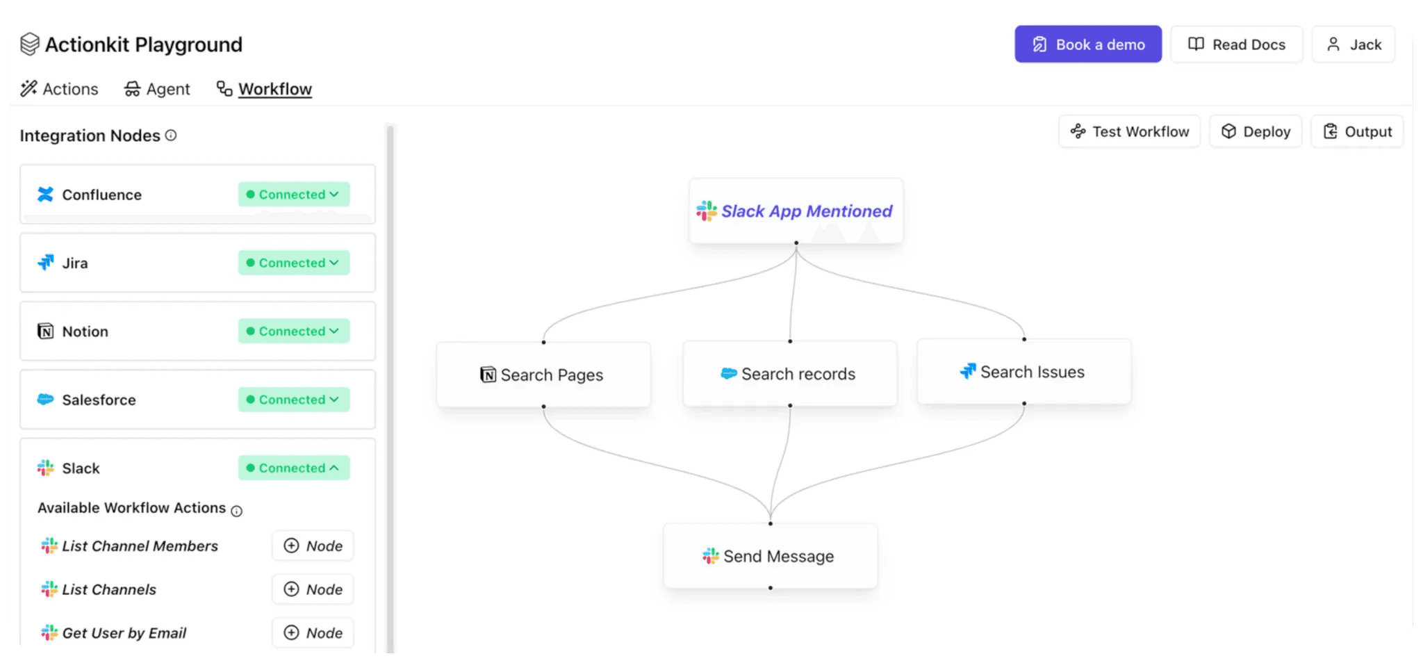 In our ActionKit Playground example, we have a Slack trigger that can initiate a variety of pre-built integration actions from ActionKit.