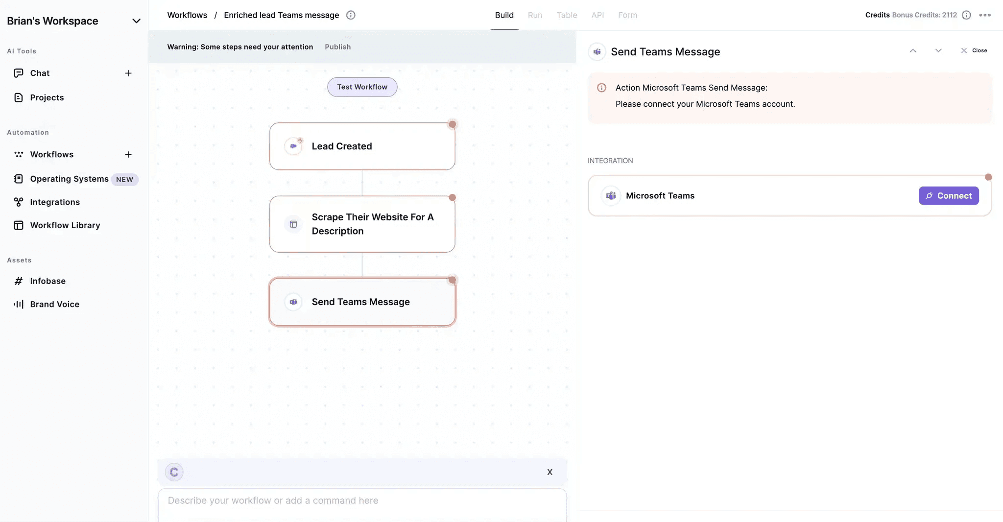 For example, Copy.ai workflows have internal actions that happen on their platform - like scraping, research, and content generations - as well as external actions that occur in their integrations - like Microsoft Teams, Slack, and Hubspot.