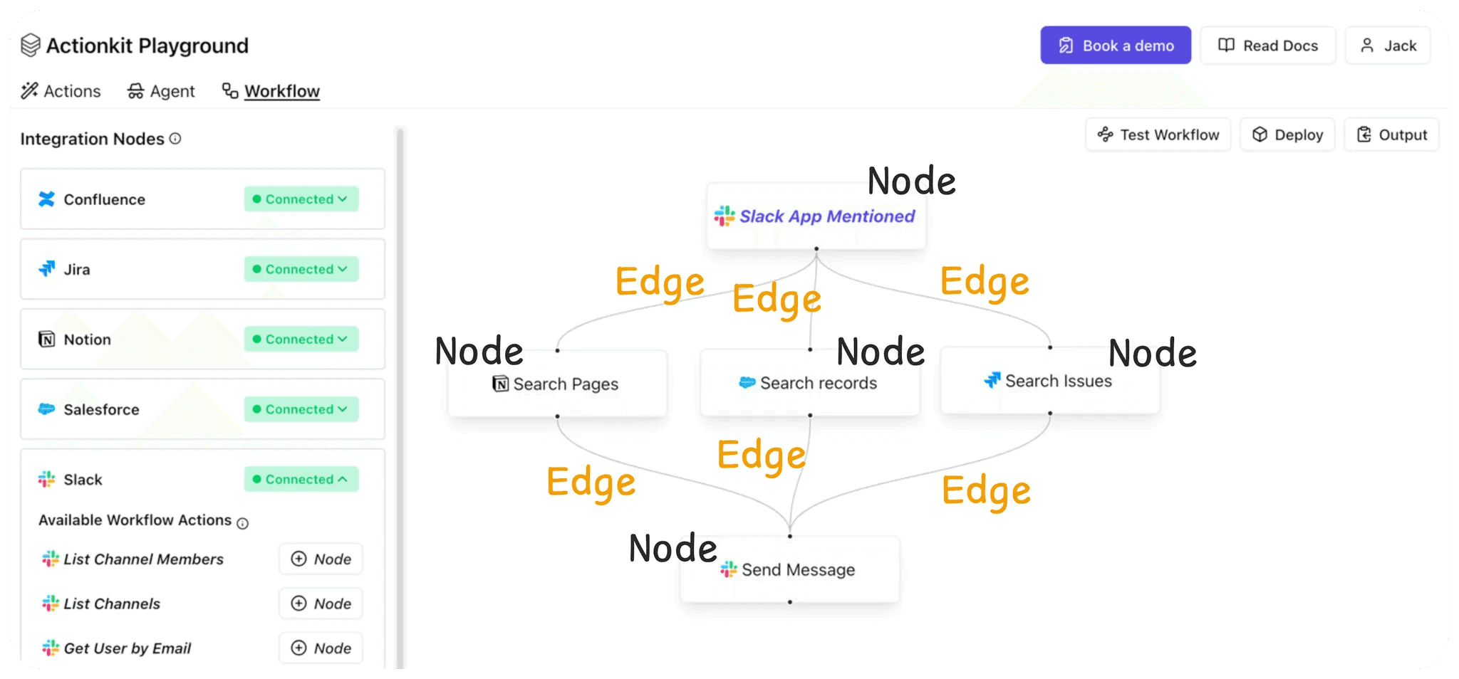 Based off node type, you can style your nodes with icons, text, and inputs. For our working example (which you can try for yourself in our ActionKit playground), we customized our nodes with 3rd-party integration icons, a step description, connection handler locations, and click behavior.