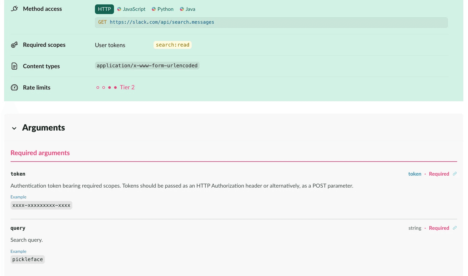 search.messagesAPI in specific ways according to the Slack documentationTo specifically search within a channel, group, or DM, add
