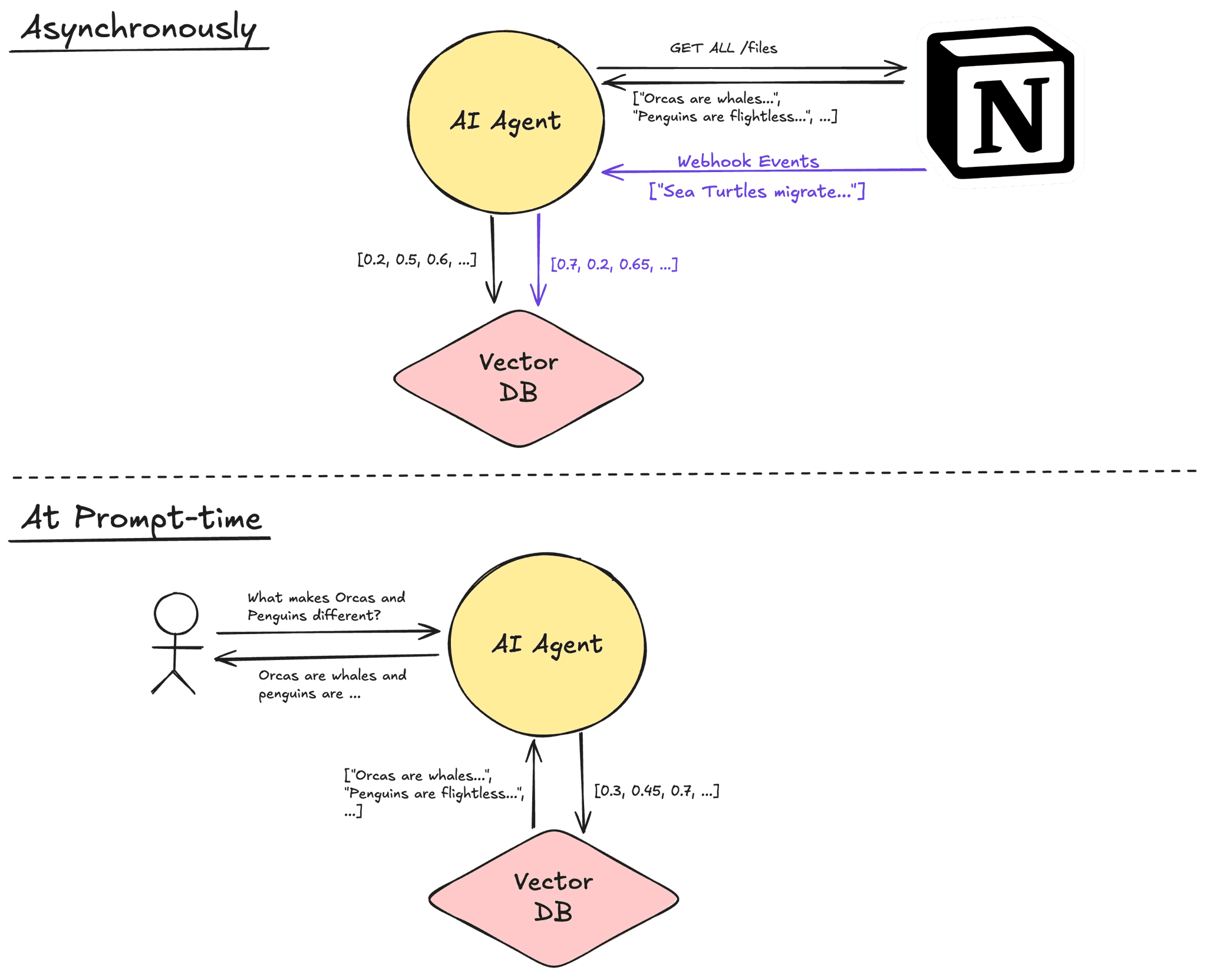 Data ingestion involves ingesting indexing data from a 3rd-party integration provider into our own vector database (ingestion), and then searching the database at prompt-time with vector search
