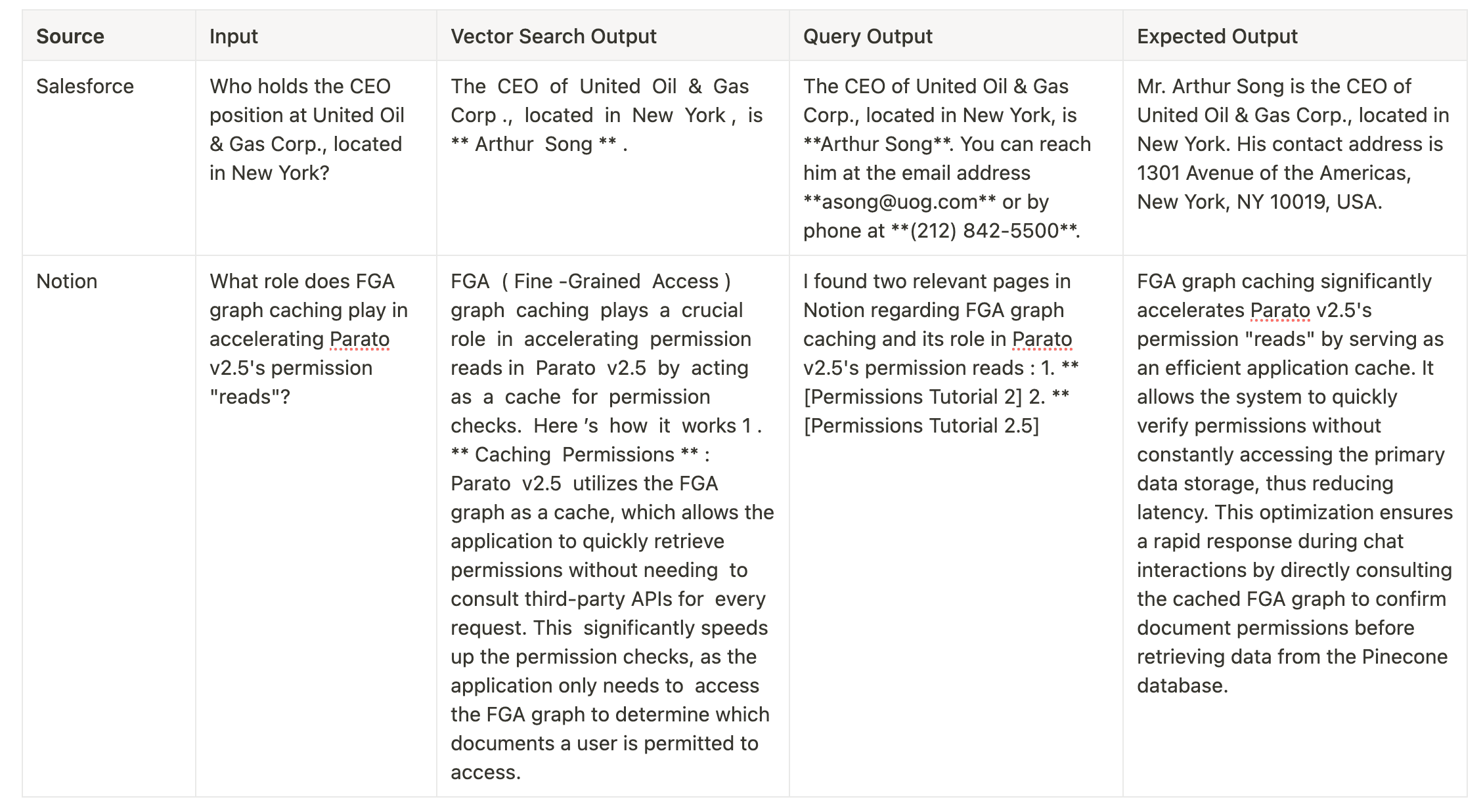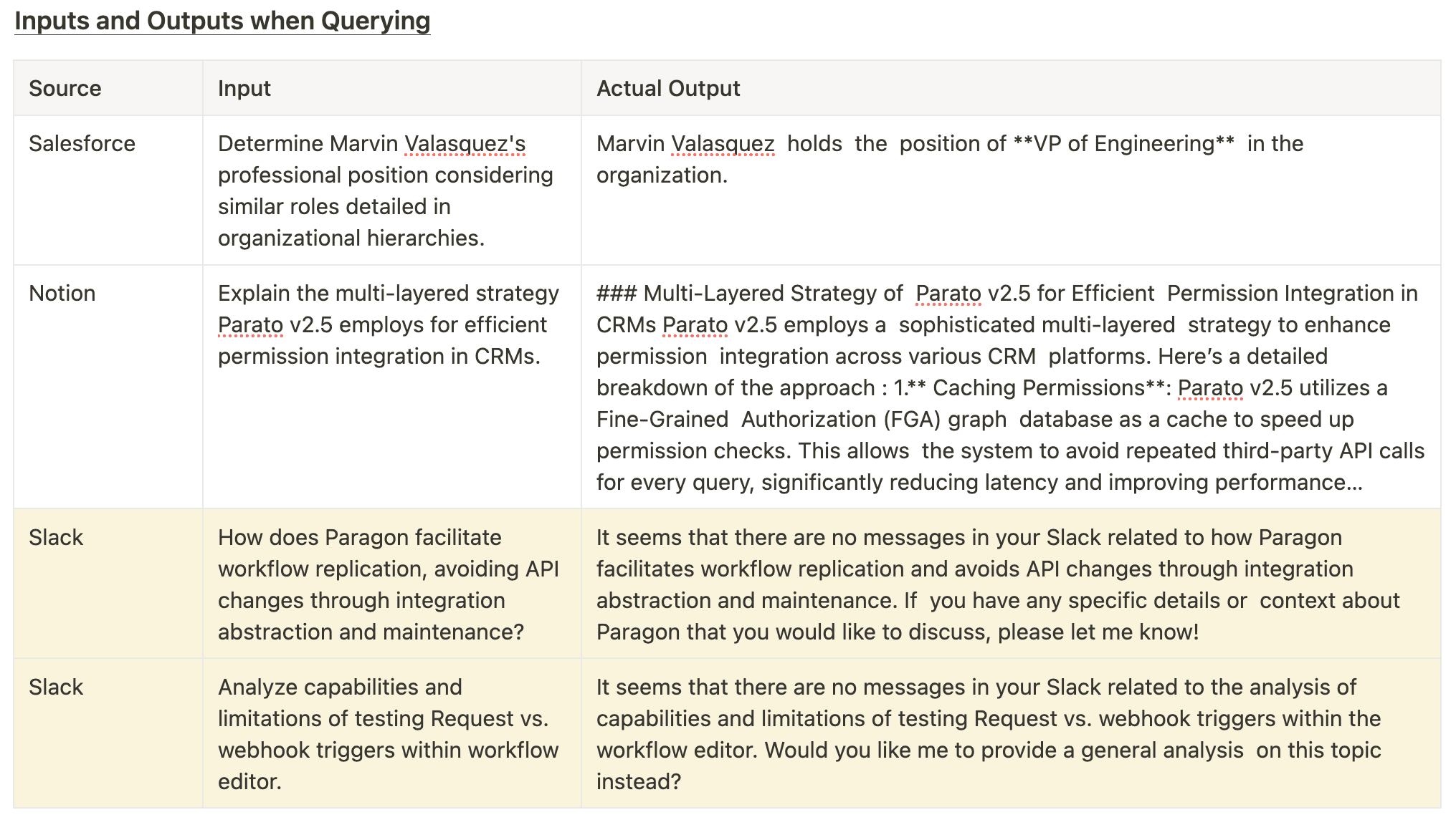 I cherry-picked a few query-based test cases to showcase that when querying for RAG, there were many chat interactions where no context was retrieved by a query tool (such as search via Slack's API), and as a result, no relevant answer was generated. When a query tool successfully retrieved context - for example in Salesforce and Notion in the table below - responses were relevant. In contrast, in our Slack examples, Parato was never able to retrieve any context using a query function tool.