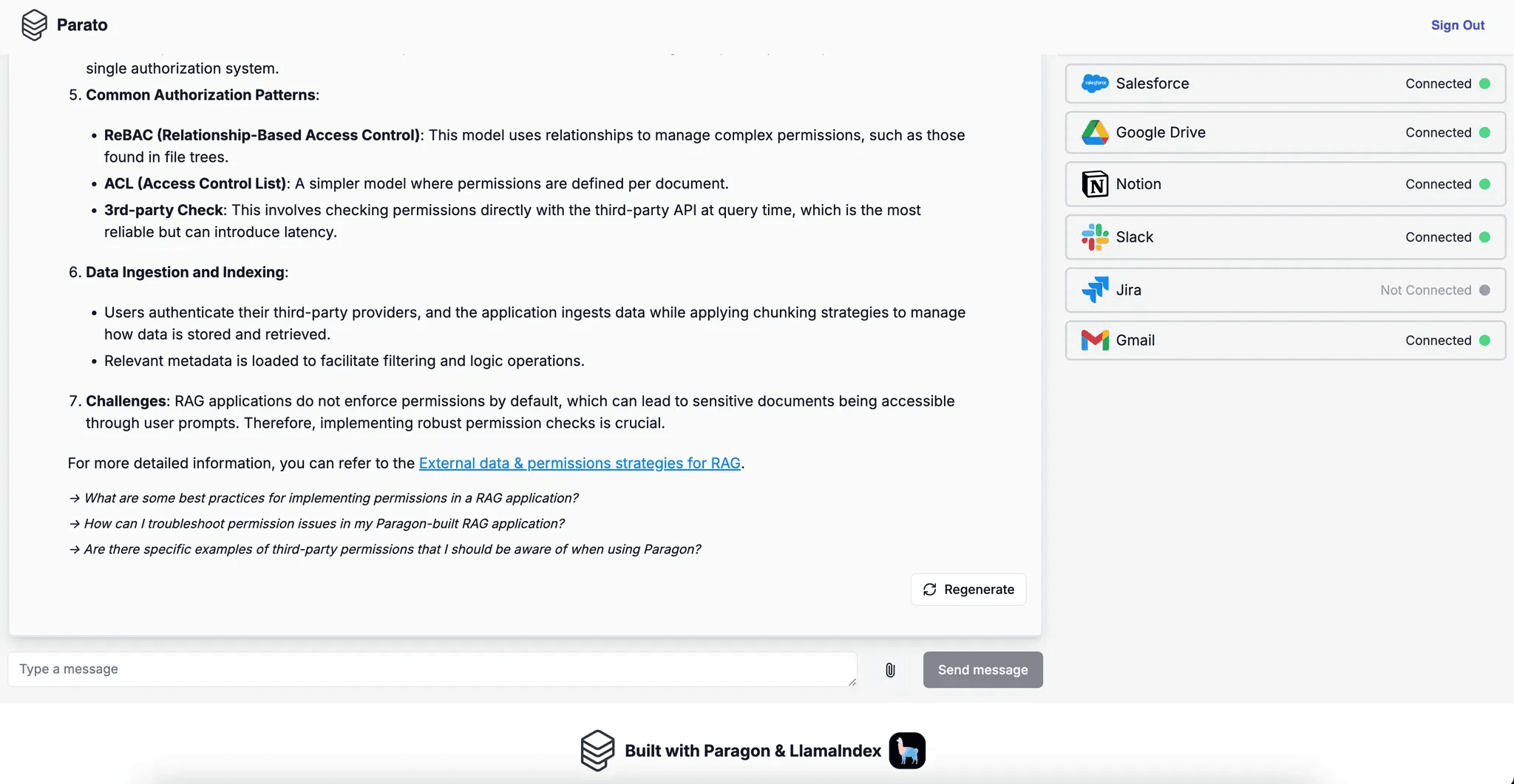 First things first, we utilized Parato, a RAG enabled AI agent we’ve built in our RAG tutorial series. Parato has basic RAG functionality with data ingestion across multiple 3rd-party platforms, permissions enforcement of ingested data assets, and tool calling capabilities across integration providers. (If you’d like to look through the tutorial and learn about building your own AI application with 3rd-party integrations, check out our Parato Series.